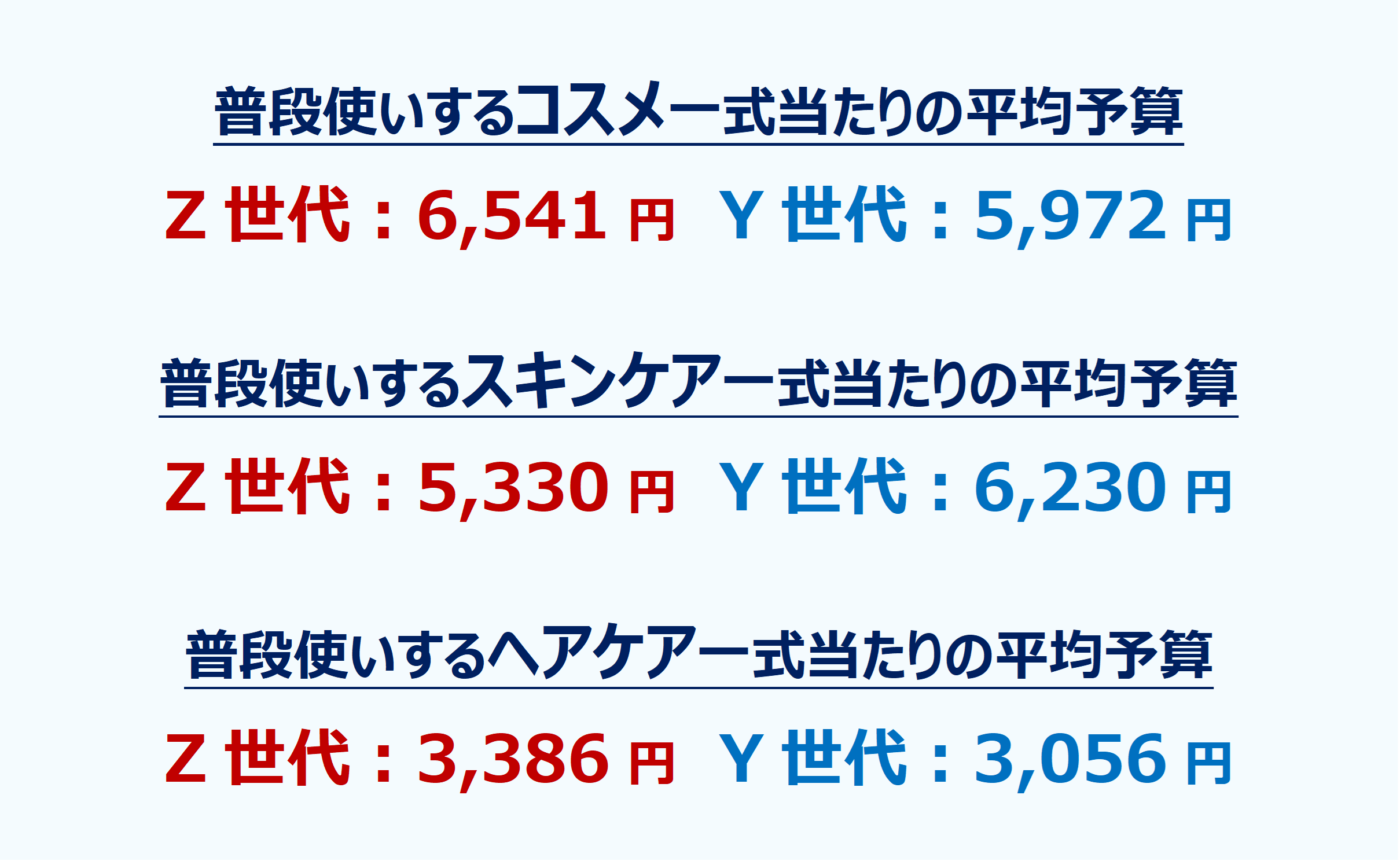 世代別で、普段使いしているコスメ・スキンケア・ヘアケア一式当たりの予算も聞きました。その結果、コスメ一式の平均予算はZ世代が6,541円、Y世代が5,972円、スキンケア一式の平均予算はZ世代が5,330円、Y世代が6,230円でした。Z世代はコスメ、Y世代はスキンケアによりお金をかけていることが分かります。ヘアケア一式の平均予算はZ世代が3,386円、Y世代が3,056円と、ほぼ同じでした。