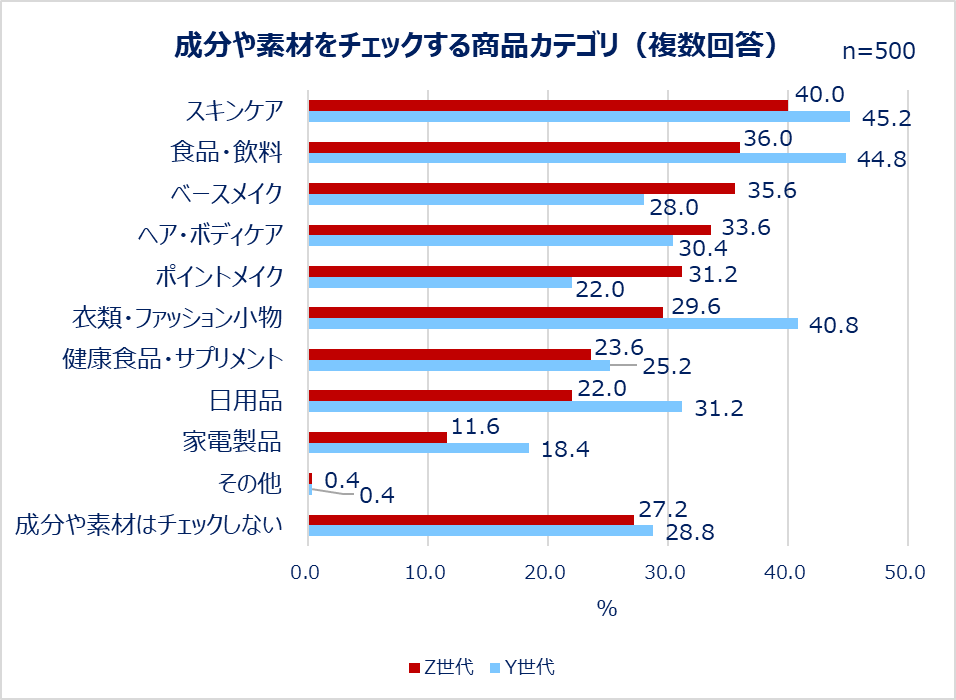 このような、成分や素材をチェックするという人は7割以上いました。特にどのようなカテゴリの商品でチェックしているかも聞き、世代別で比較したところ、1位は両世代ともに「スキンケア(Z世代:40.0%/Y世代:45.2%)」、2位は「食品・飲料(Z世代:36.0%/Y世代:44.8%)」でした。Y世代は「衣類・ファッション小物(40.8%)」「日用品(31.2%)」でもチェックする人が多いことが分かりました。