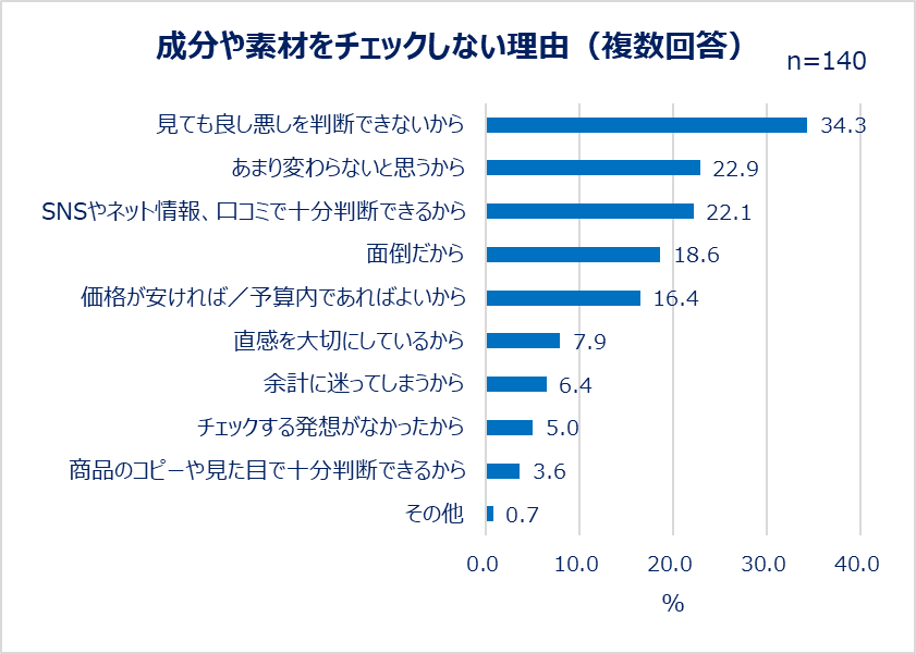 成分や素材をチェックする理由は「納得して購入できるから(41.7%)」が1位に。自分なりに納得感を持って購入したいという人は多いのかもしれません。成分や素材をチェックしない人にもその理由を聞いたところ、1位は「見ても良し悪しを判断できないから(34.3%)」でした。細かい成分や素材まで見ずとも「SNSやネット情報、口コミで十分判断できるから(22.1%)」という人も約2割おり、一部の人は他者目線での情報も活用して買い物しているようです。