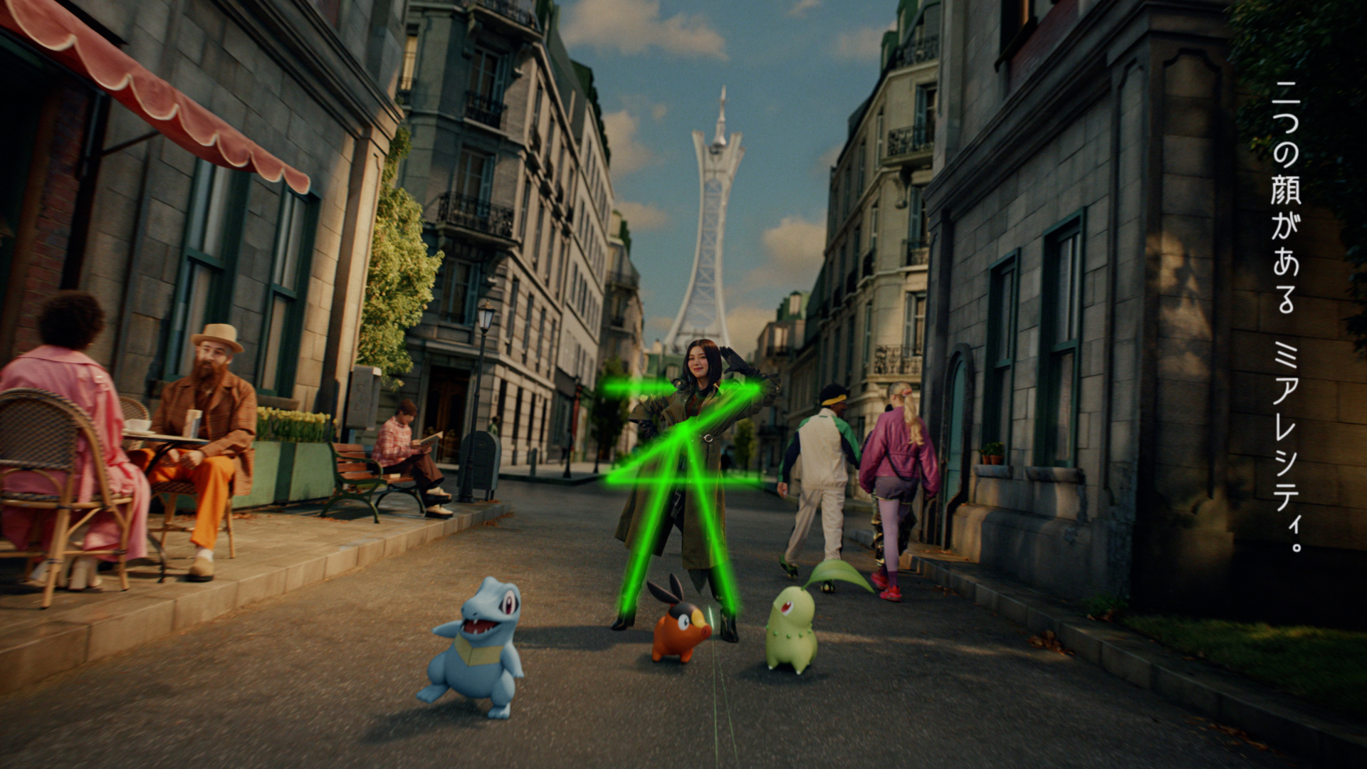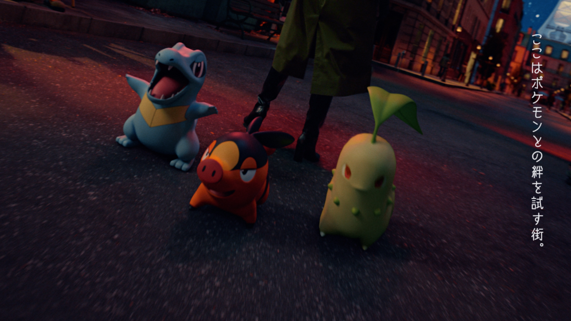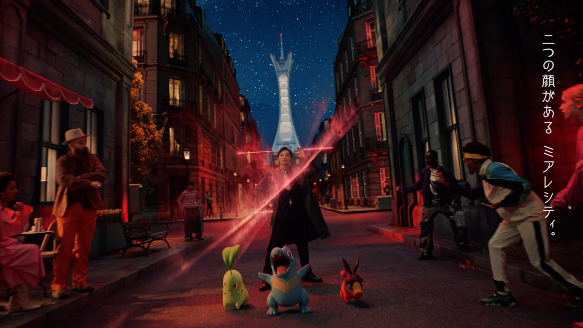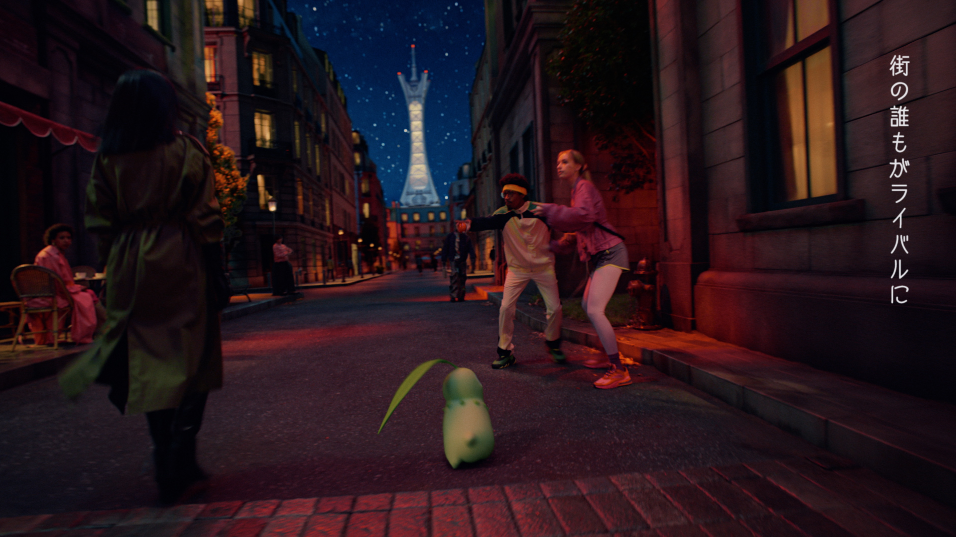 「夜になれば」という池田エライザさんの声かけで、パートナーポケモンであるチコリータ、ポカブ、ワニノコを連れ、ミアレシティの夜の街を颯爽と歩き出します。夜のミアレシティは誰もがライバル。住民たちは池田さんに視線を送り、パートナーポケモンたちも警戒心をあらわにします。モンスターボールを取り出し、池田さんも臨戦態勢に。