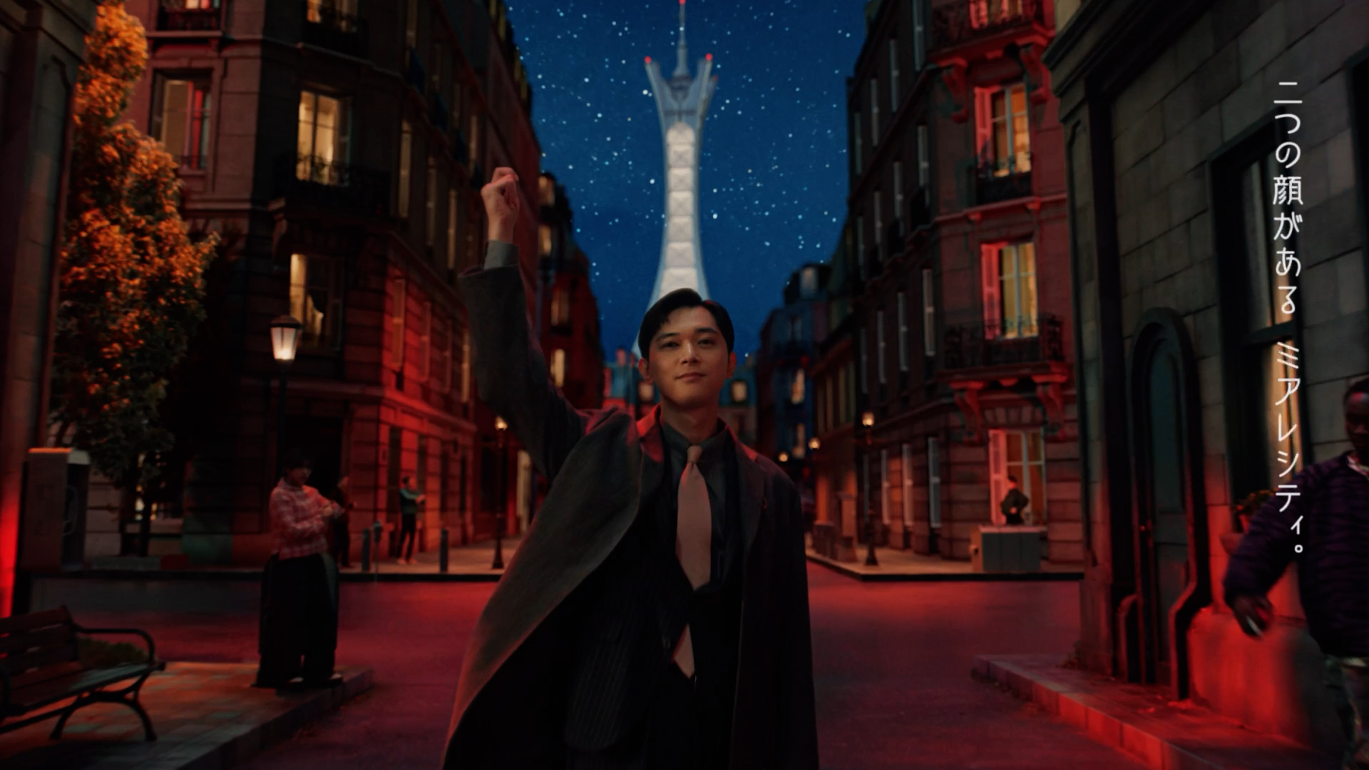 「昼と夜」という吉沢さんの掛け声に合わせ、華麗なターンをしながら指を鳴らすと、昼間の穏やかなミアレシティは一瞬にして夜の風景へと早変わり。夜のミアレシティは誰もがライバル。談笑していた住民も、散歩をしていた住民も、全員が今にも吉沢さんへ戦闘を仕掛けそうな臨戦態勢へ。これをうけて吉沢さんもモンスターボールを片手に、爽やかな表情で『Pokémon LEGENDS Z-A』にちなんだ「ぜってーおいで」というクールな決め台詞とともにポケモンたちと臨戦態勢を取ります。