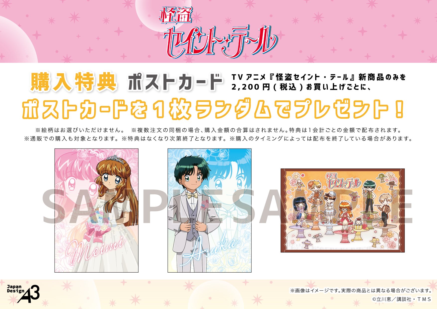 TVアニメ『怪盗セイント・テール』新商品のみを1会計2,200円(税込)お買い上げごとに、購入特典としてポストカード(全3種)をランダムで1枚プレゼント。