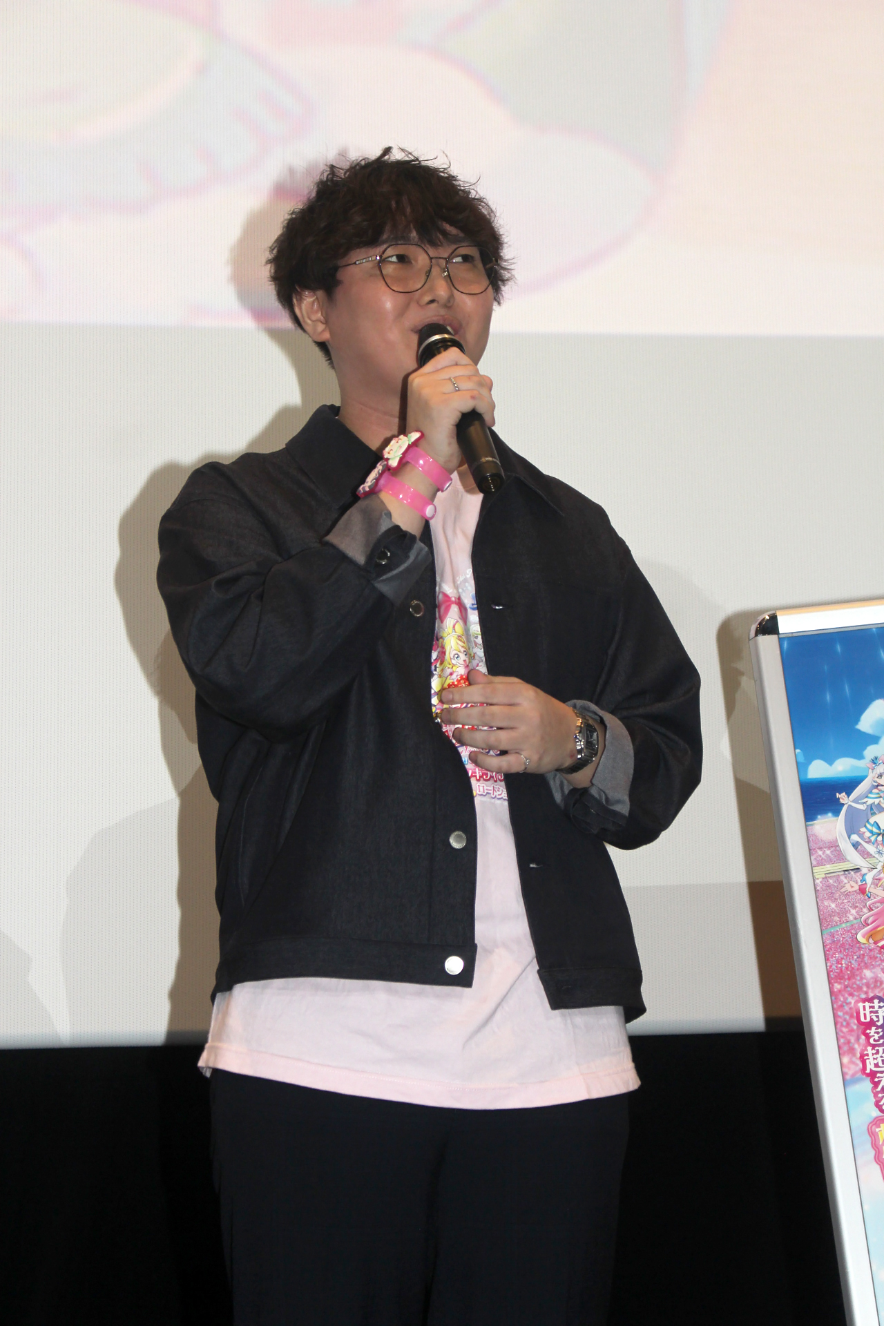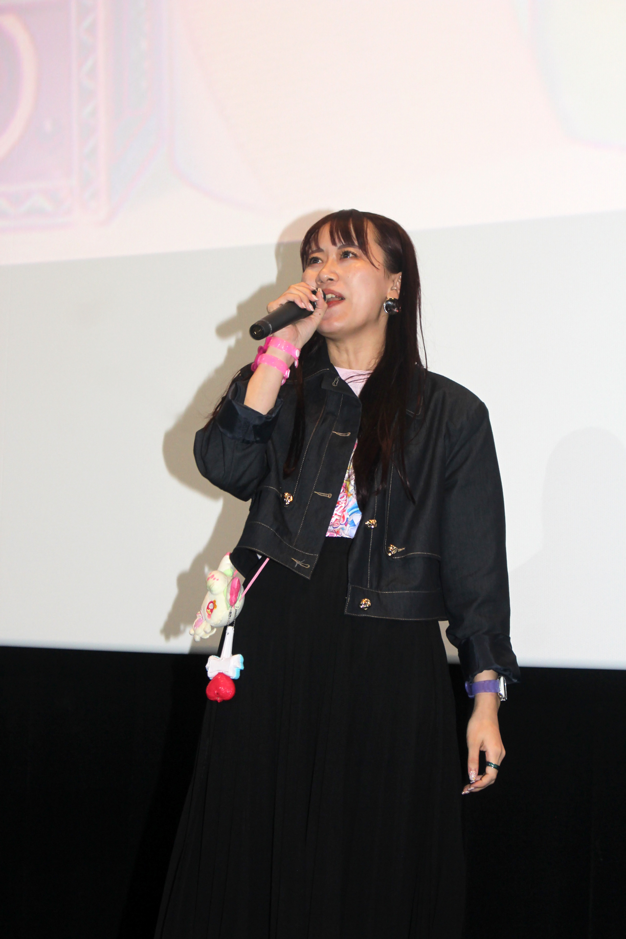 そんな皆川プロデューサーはこだわりポイントについて「キュアアイドルたちはゴージャスな衣装を着ているけど、アイドルなので、踊れる丈感と布感にこだわりました。最初はもっと厚手の着物っぽい衣装でしたが、『踊るなら、もうちょっと薄くした方がよくない?』と思って」と話すと、板岡さんが「描いても描いてもOKが出ないんですよ!」と暴露。皆川プロデューサーは「素敵な衣装ですよね?」とお客さんに尋ねると、たくさんの拍手が起き、板岡さんも笑顔に。皆川プロデューサーはホッとした表情になって「映画ならではの、とてもかわいい一面を見せてあげられたかなと思っています」。