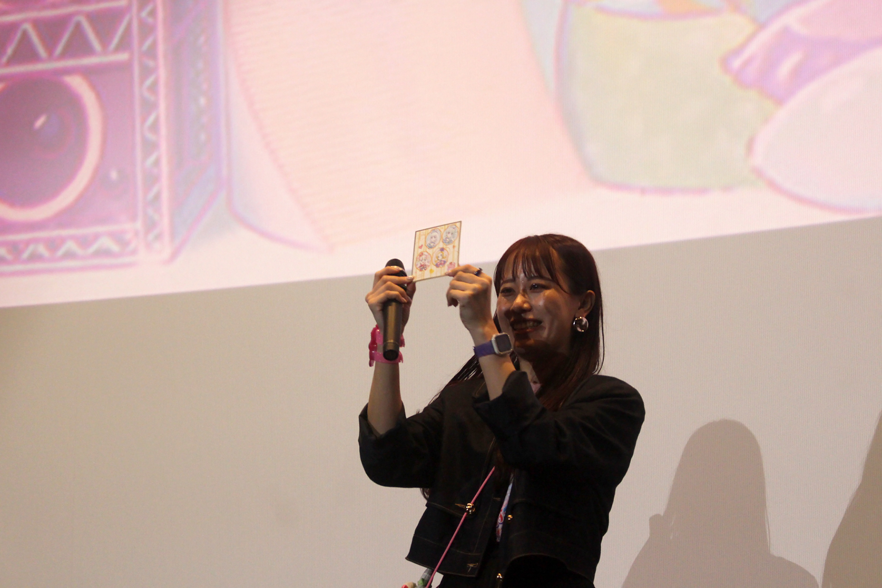板岡さんは「絵の担当なので、いい顔にしようと。それだけですよね。あとは監督の仰せのままに(笑)。監督の作りたい映像を作るのが自分たちの仕事ですから。あとは観てくれた人に、推しが出て喜んでもらえればと頑張って。キャラクターを魅力的に描ければというのがこだわりかもしれません」。また応援上映でシーンごとに変わるお客さんに反応を見た感想を尋ねられると「誉め言葉ですが、どうかしてます(笑)」を発言すると、お客さんも大爆笑。その様子を見ると嬉しそうな笑顔で、改めてお客さんへ「ありがとうございます」と感謝の言葉を述べていました。