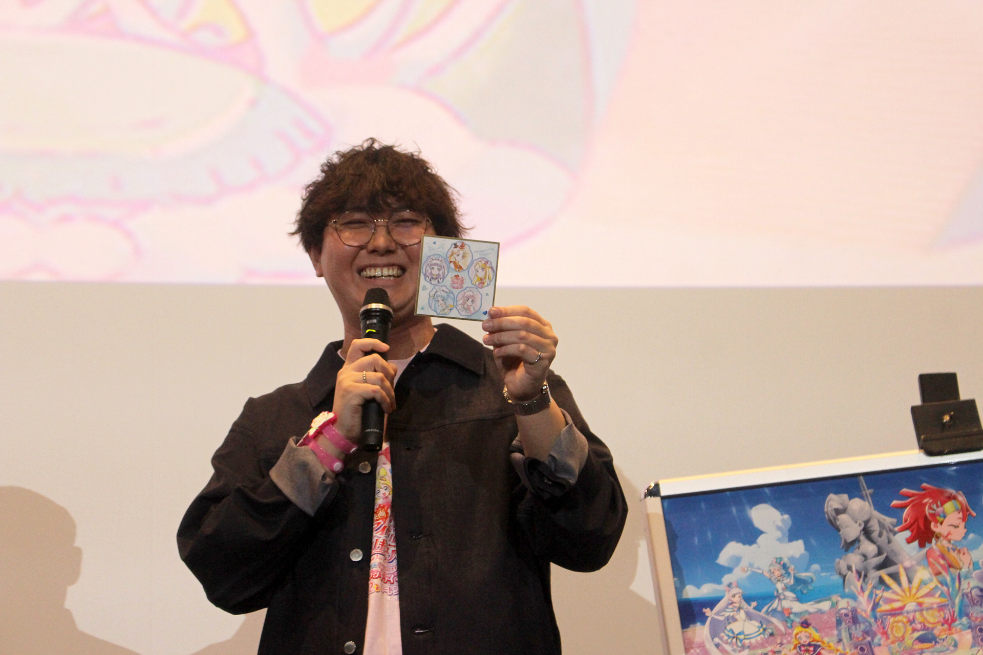 続いて、10月10日より劇場の入場者特典が「キミに贈る♪スペシャル色紙風カード」になることも明らかに。『キミプリ』『わんぷり』『ひろプリ』の3種類からランダムで配布されるそうで、イラストは板岡さんが新規に描き下ろしたとのことです。「頑張って描きました。この絵は生の色紙に描いて、キャストのサイン入りで東映アニメーションミュージアムに展示されています。あと、ここにはありませんがテラとアマスもサイン入りのものがあります。更に宣伝部さんが頑張ってくれて、最終的に抽選でプレゼントします」と話すと、お客さんから「ありがとう!」の大合唱。最後に、小川監督から皆さんへのメッセージも、寺迫さんの代読により、紹介されました。