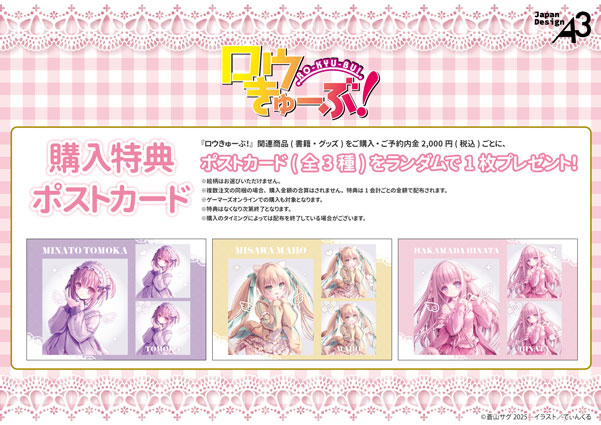 期間中に会場内で『ロウきゅーぶ!』関連商品(書籍・グッズ)を購入・ご予約内金2,000円(税込)ごとに、特典ポストカード(全3種)がランダムで1枚もらえます。
