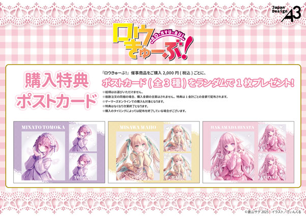 期間中、ゲーマーズオンラインショップで『ロウきゅーぶ!』催事商品を購入2,000円(税込)ごとに、特典ポストカード(全3種)がランダムで1枚もらえます。