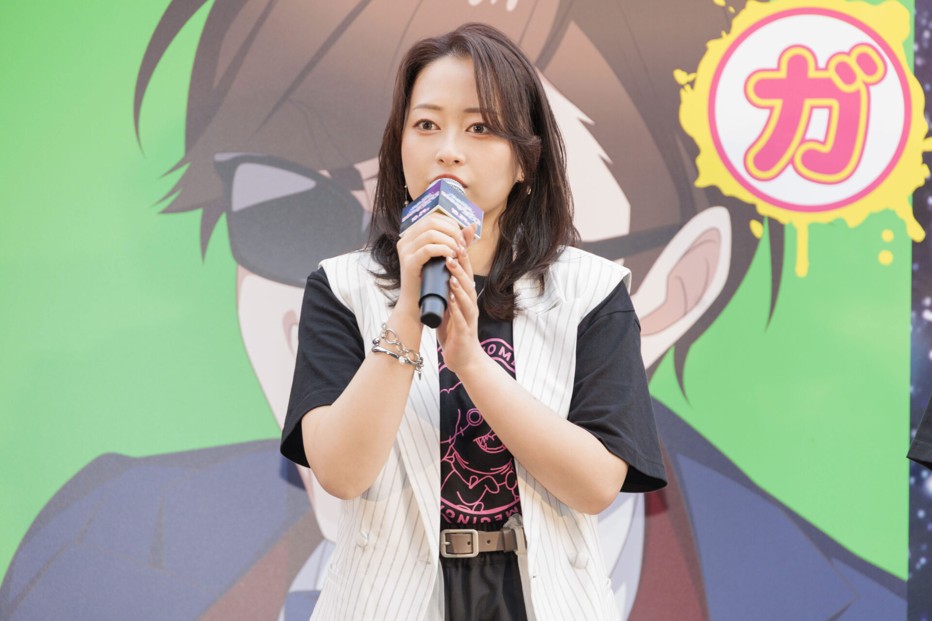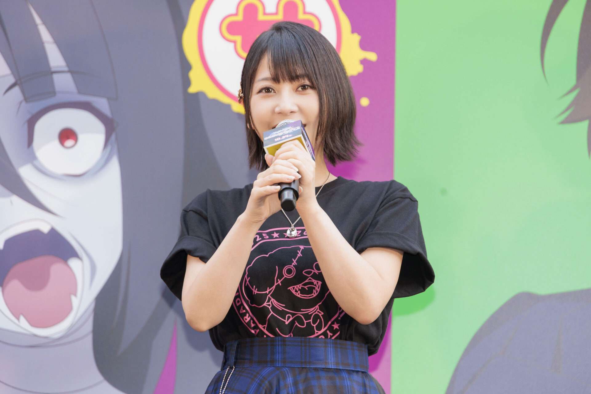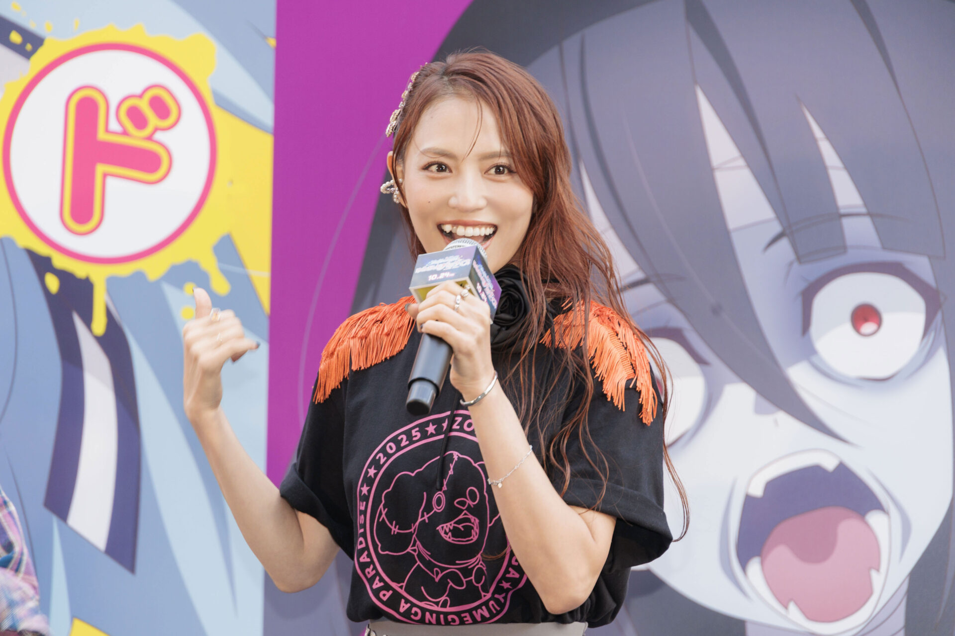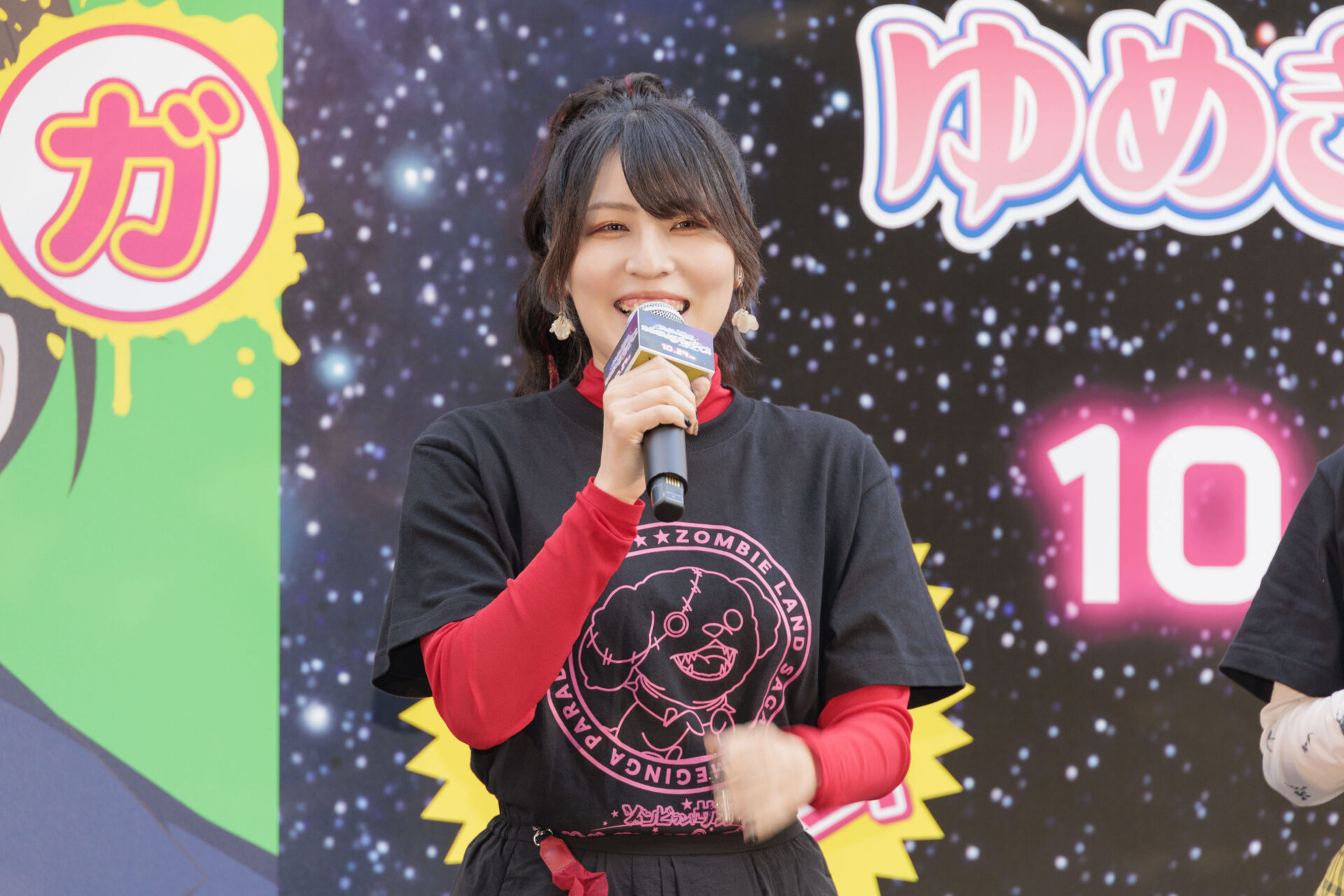 全国の主要都市 東京、横浜、名古屋、大阪、広島、福岡、長崎、佐賀県と全国の名所を2週間をかけて横断して、全国制覇を目指す本作のアドトラック“腐乱臭衆ゾンビィ号”について聞かれた本渡は「ゾンビランドサガというオリジナルアニメとして立ち上がったものが、トラックで全国を走り回るなんて、本当に皆さんのおかげでここまで大きくなりました。すごい楽しみです!」とコメントすると、続けて田野は「1話でさくらがバイーンって飛ばされたけど、そうにはならないようにはしていただきたい」と会場の笑いを誘いました。