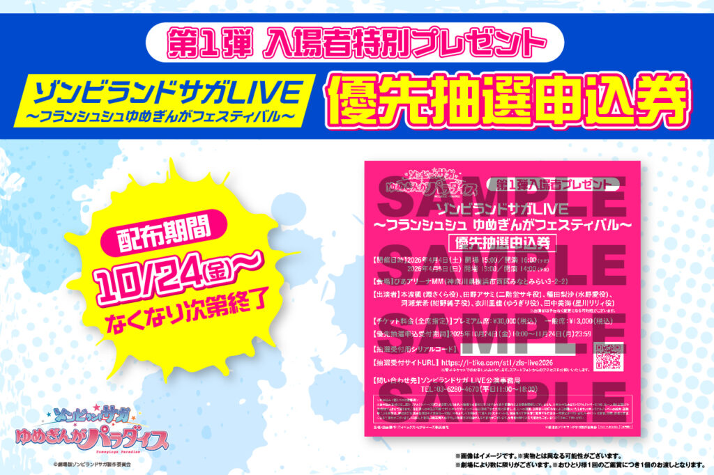 2026年4月に開催が決定したリアルLIVE「ゾンビランドサガLIVE〜フランシュシュゆめぎんがフェスティバル〜」。このスペシャルなLIVEのチケット抽選にどこよりも早く申し込むことができるシリアルコードがついた「優先抽選申込券」を入場者特典として配布いたします!