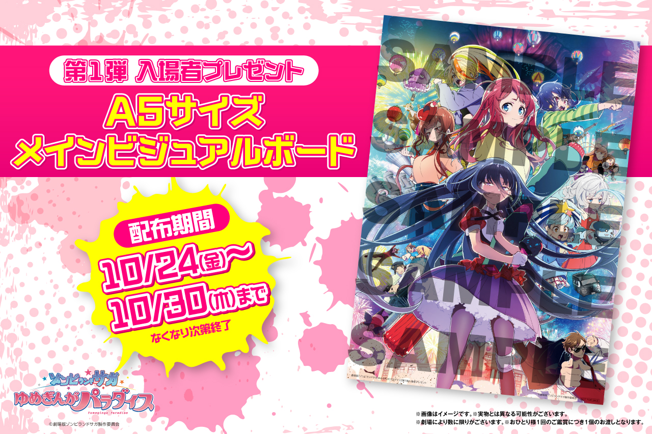 劇場版『ゾンビランドサガ ゆめぎんがパラダイス』のメインビジュアルを使用したA5サイズのオリジナルビジュアルボードを入場者特典として配布いたします!