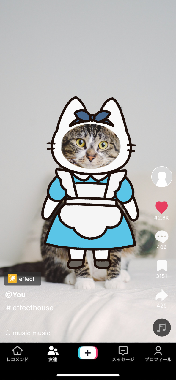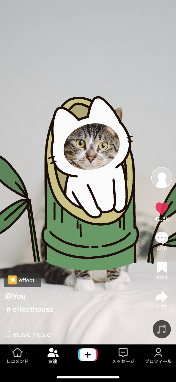 タップすることで3種類のキャラクターに変身することが可能に。ぜひ主題歌「夢中猫」の音源をつけて投稿してみましょう!
