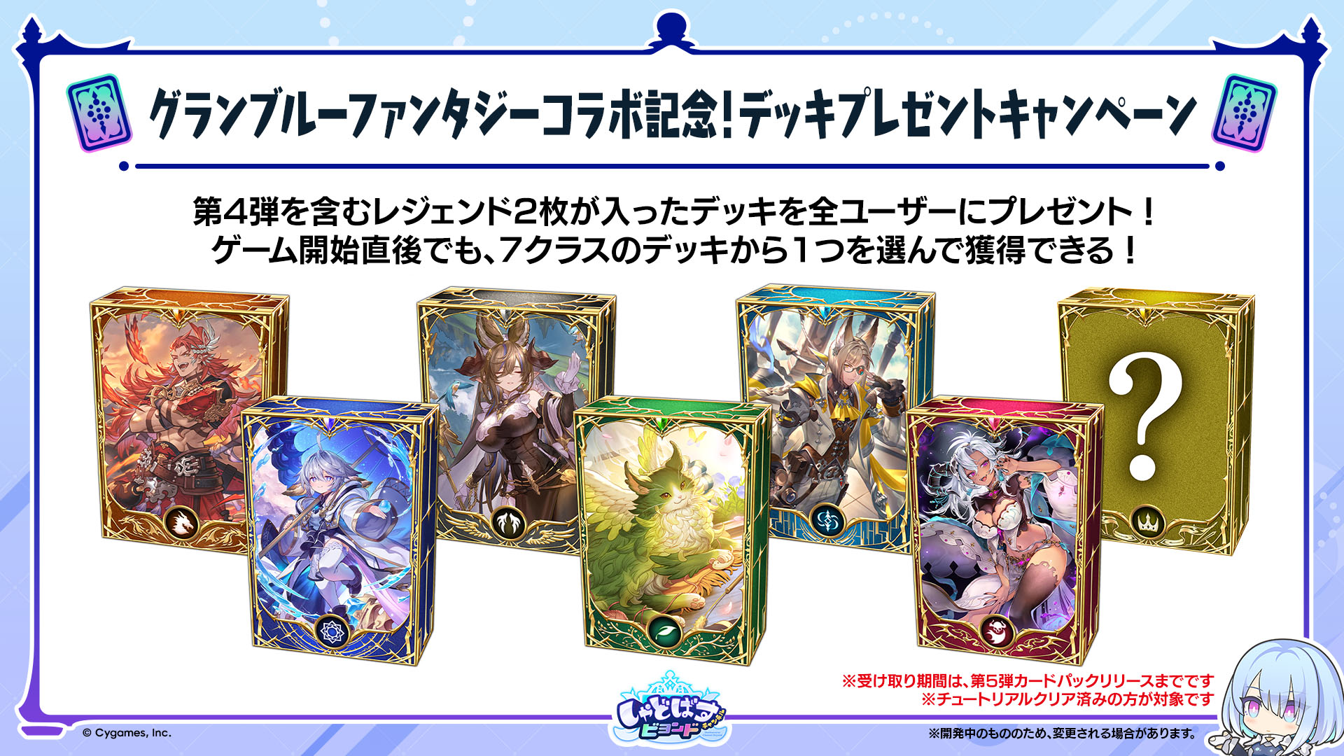 『グランブルーファンタジー』とのコラボを記念して、7クラスのおすすめデッキから好きなものを選んで獲得できるデッキプレゼントキャンペーンも開催決定。