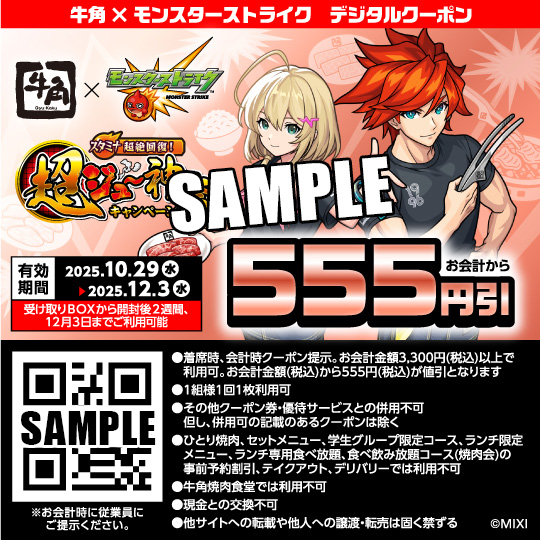 コラボ開催を記念して、モンストアプリ内でゲームユーザー全員に牛角555円引デジタルクーポンをプレゼント! さらに! 対象期間中にログインしたゲームユーザー全員にゲーム内アイテムをプレゼント!