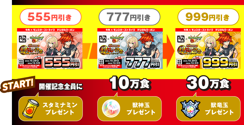 10月29日(水)からスタートする『モンスターストライク』と牛角のコラボキャンペーン「スタミナ超絶回復!超ジュ~神祭キャンペーン」。