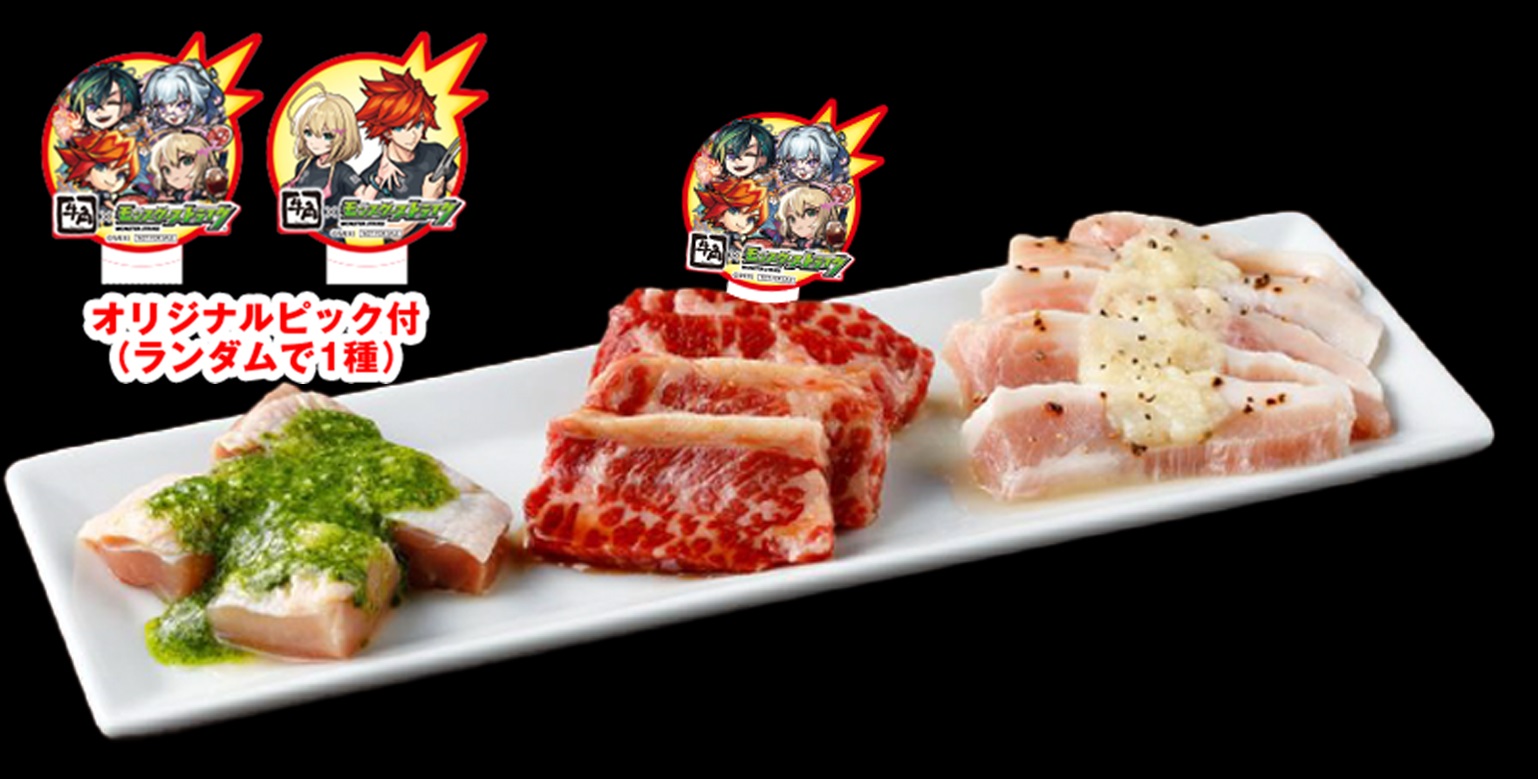 同キャンペーンでは、オリジナルレンチキュラーキャラメッセージカードがもらえるコラボメニューが登場するほか、店内で楽しめる「超ジュ~神祭ガチャ」、モンスターストライクユーザー限定「牛角デジタルクーポン」プレゼントなどが実施されます。