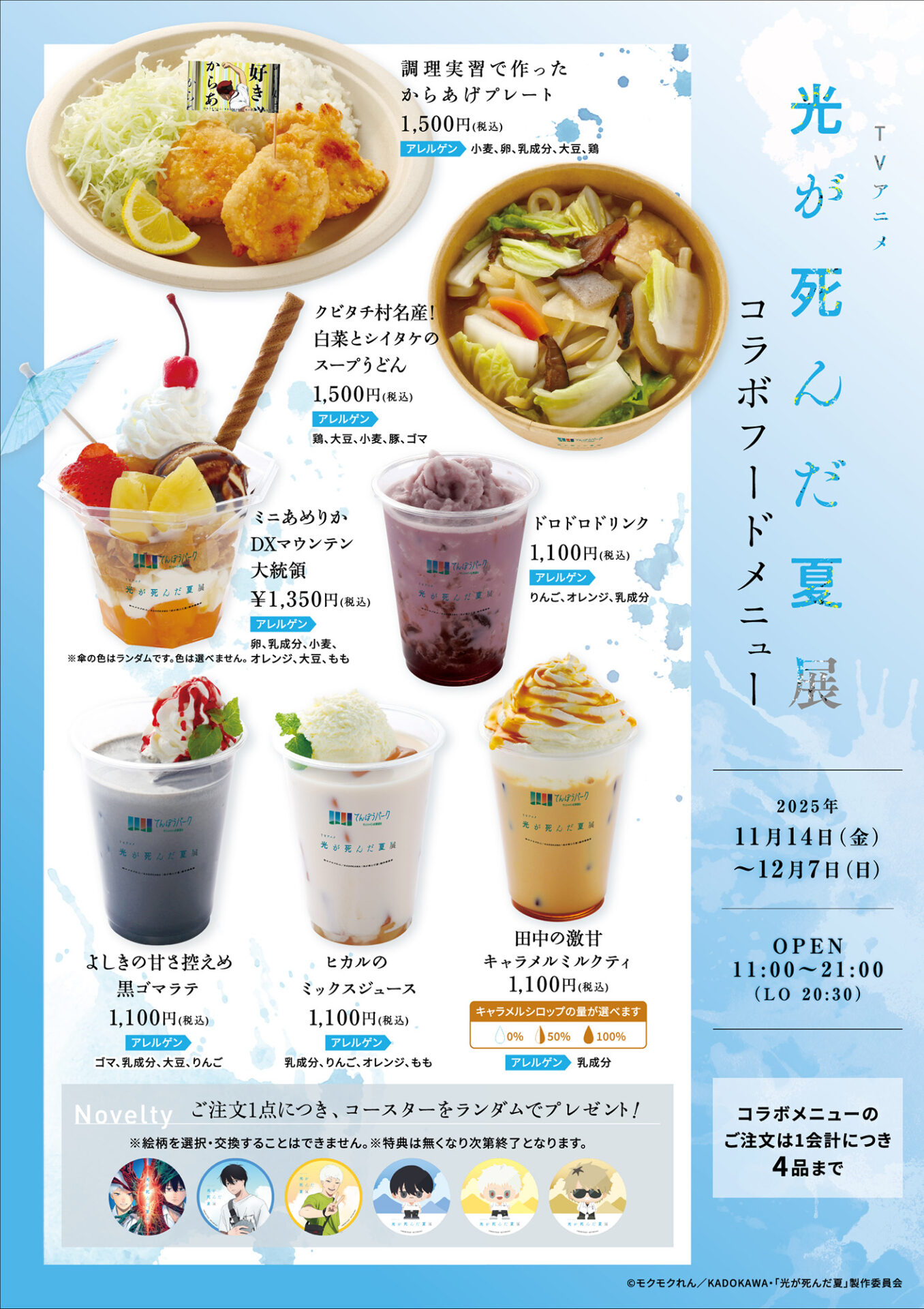 コラボメニューには、よしき・ヒカル・田中をイメージしたコラボドリンクや作中に登場したフードも。なお、購入特典として、コラボメニューの注文1品につき、オリジナルコースター6種からランダムで1枚がプレゼントされます(特典は無くなり次第終了)。