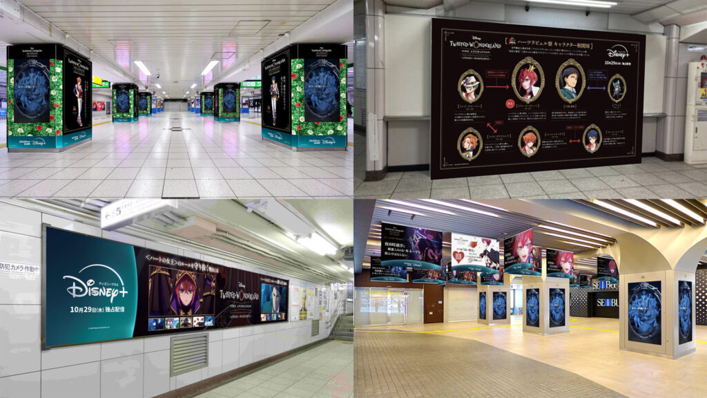 池袋駅構内の6つの大型広告面には、シーズン1「エピソード オブ ハーツラビュル」の主要7キャラクターのアートが掲出されたサイネージや「ハートの女王の法律」を紹介するフラッグ、インスパイア元となったディズニー映画のヴィランズたちをあしらった柱面など、多面的に作品の魅力を紹介する仕掛けが盛りだくさん!