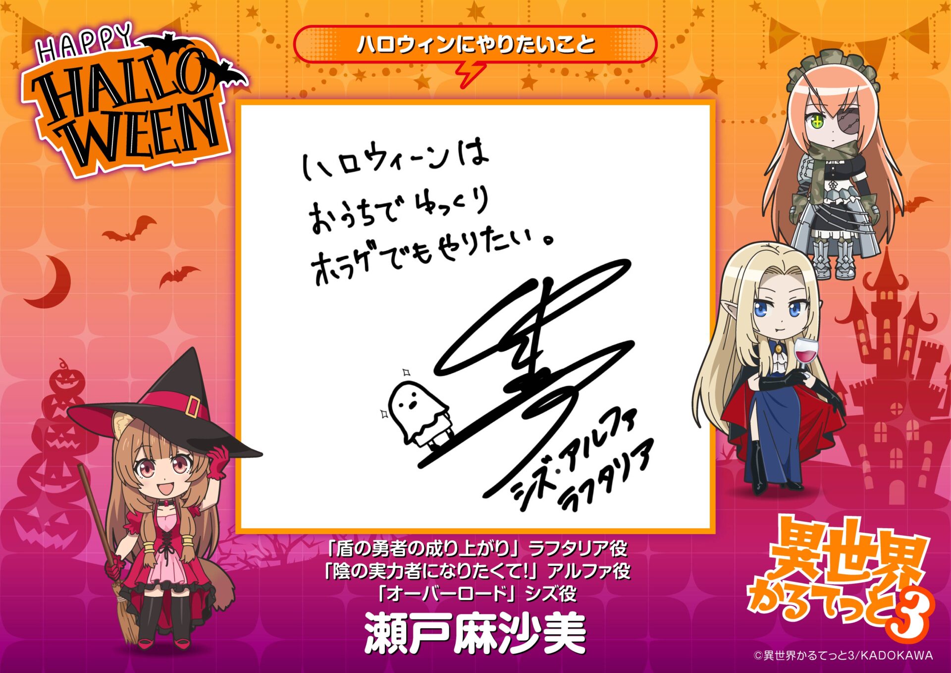 ハロウィンビジュアルには、『オーバーロード』のアルベド、『この素晴らしい世界に祝福を!』のアクア、『Re:ゼロから始める異世界生活』のエミリア、『幼女戦記』のヴィーシャ、『盾の勇者の成り上がり』のラフタリア、『陰の実力者になりたくて!』のアルファが仮装している姿が描かれています。