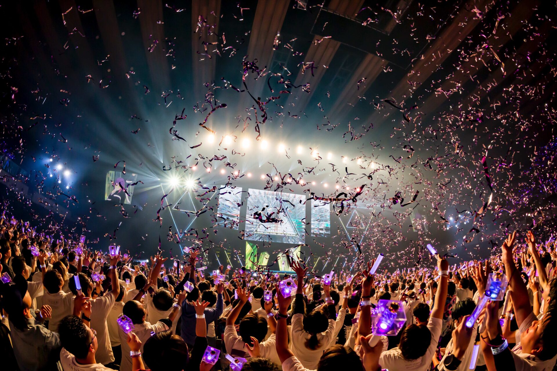 ステージ上をゆっくりと歩きながら、「Palette」とnikiが手掛けたロックバラードを3連続でつなげるころには、その選曲から、彼女がこのライブにかけた覚悟とメッセージが伝わってくる気がした。ラスサビでは1stライブ衣装に早替え。演出含め最初からクライマックスのようなたたみかけに、圧倒されながらも陶酔していた眷属。しかし続くMCでトワが「こんやっぴー!」と挨拶すれば、すかさず元気に「こんやっぴー!」とレスポンスする。