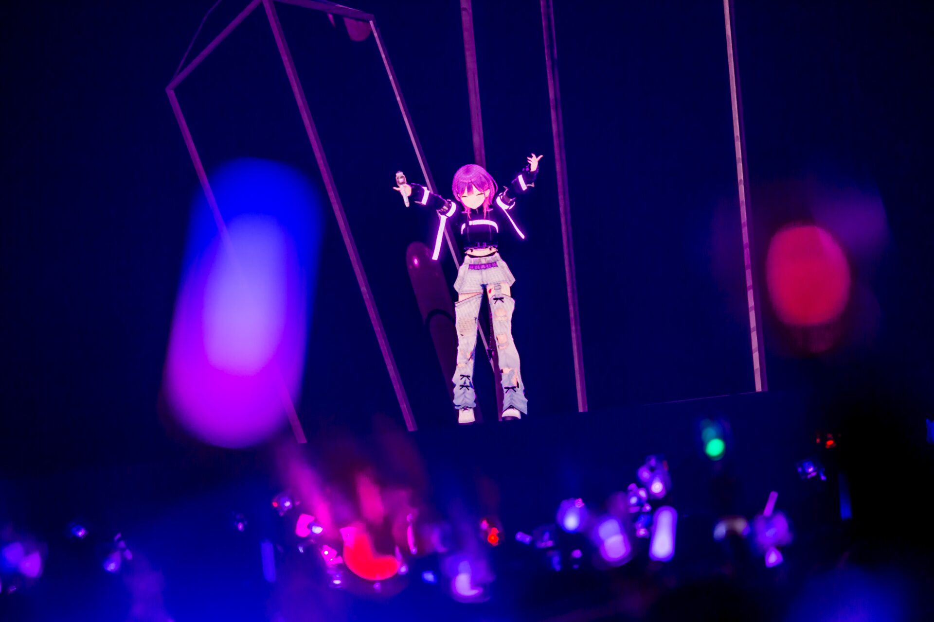 「トワの中でこのライブは、通過点、進化ととらえています。今後3rdライブもできるように、方向性が決まった常闇トワを表現できるように頑張っていくので、これからも着いてきてくれるとうれしいです! この瞬間、全員で紡ごう!」――そうしてエモーショナルな歌い出しで始まった、今日最後の曲「不可視」。闇の中の一筋の光を手繰るようなこの曲は、希望を持たせてくれるエンディングだ。<また夢を見よう 私も怖いけど 君がいれば、>――そう歌い終わった直後、「今日ここにあった光を明日につなげて、また次のステージで!」と叫ぶ表情は晴れやかそのものだった。ロングバージョンのアウトロの途中、ステージの階段を登りだした彼女は一度だけこちらを振り向いて笑ったが、次の瞬間にはもう光に満ちた扉の向こうへと行ってしまった。