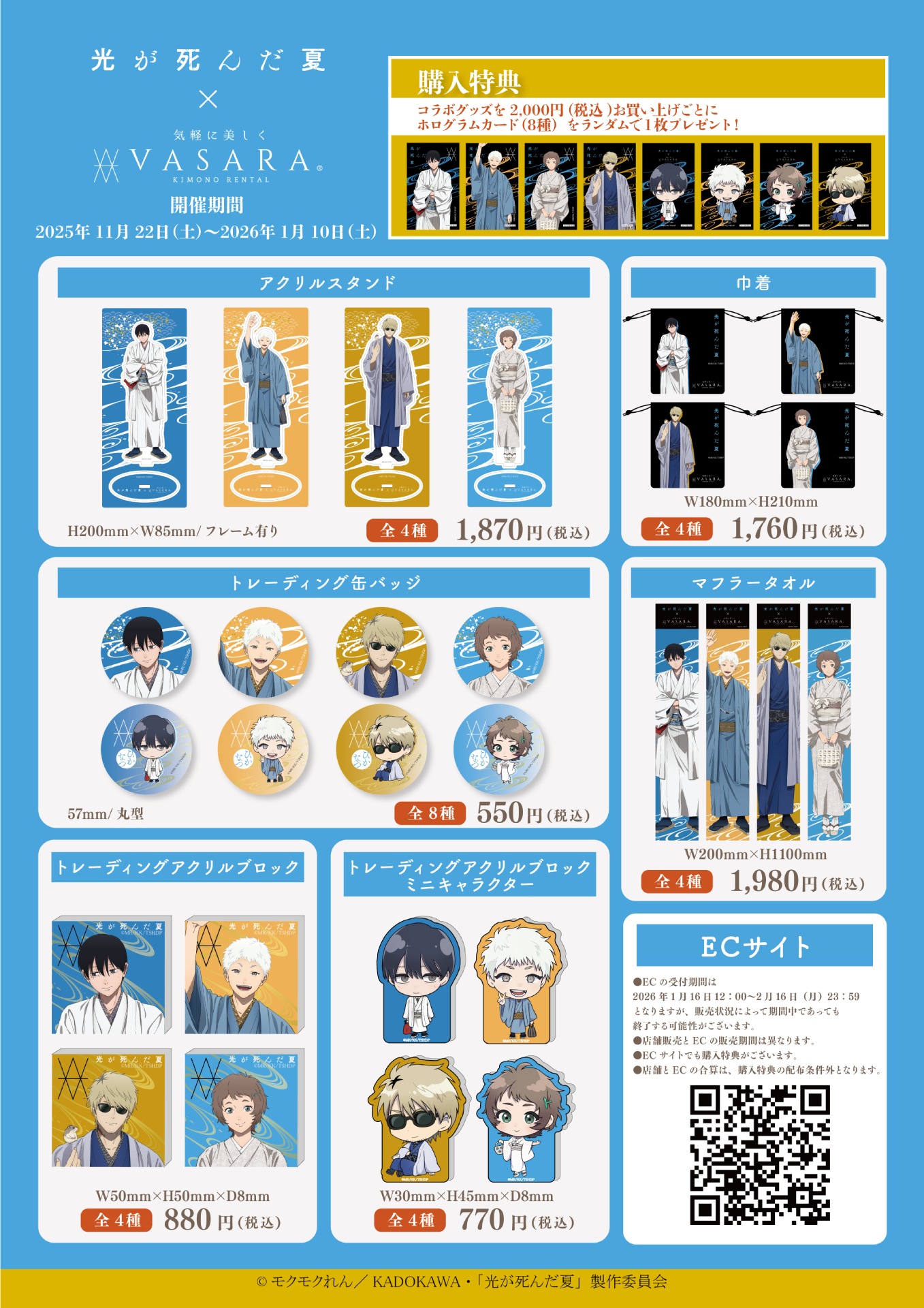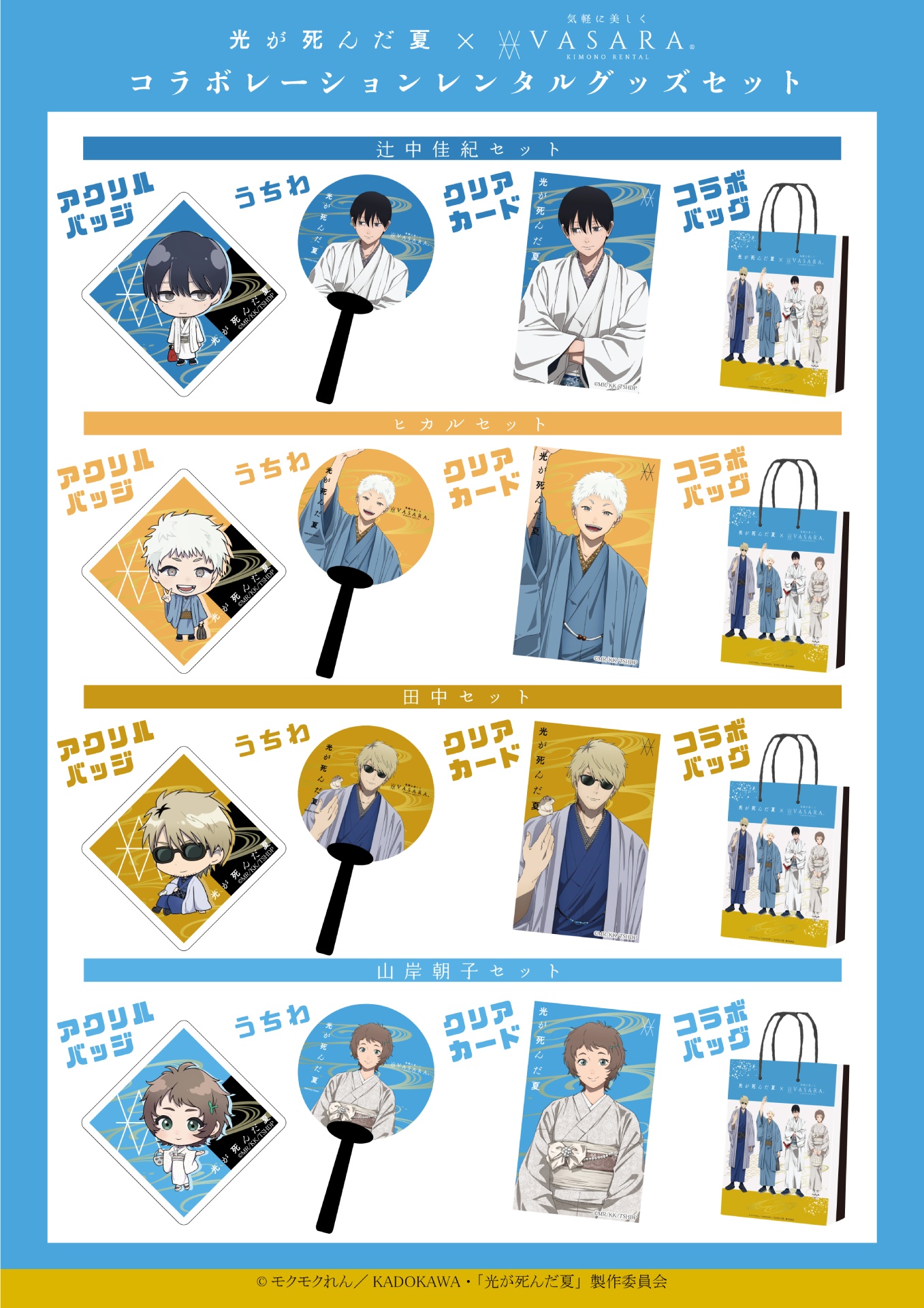 TVアニメ『光が死んだ夏』と「着物レンタルVASARA」のコラボキャンペーンでは、「レンタルグッズ4点セット」(内容:アクリルバッジ、うちわ、クリアカード、コラボバッグ)が付いてくる着物レンタルプランが登場。