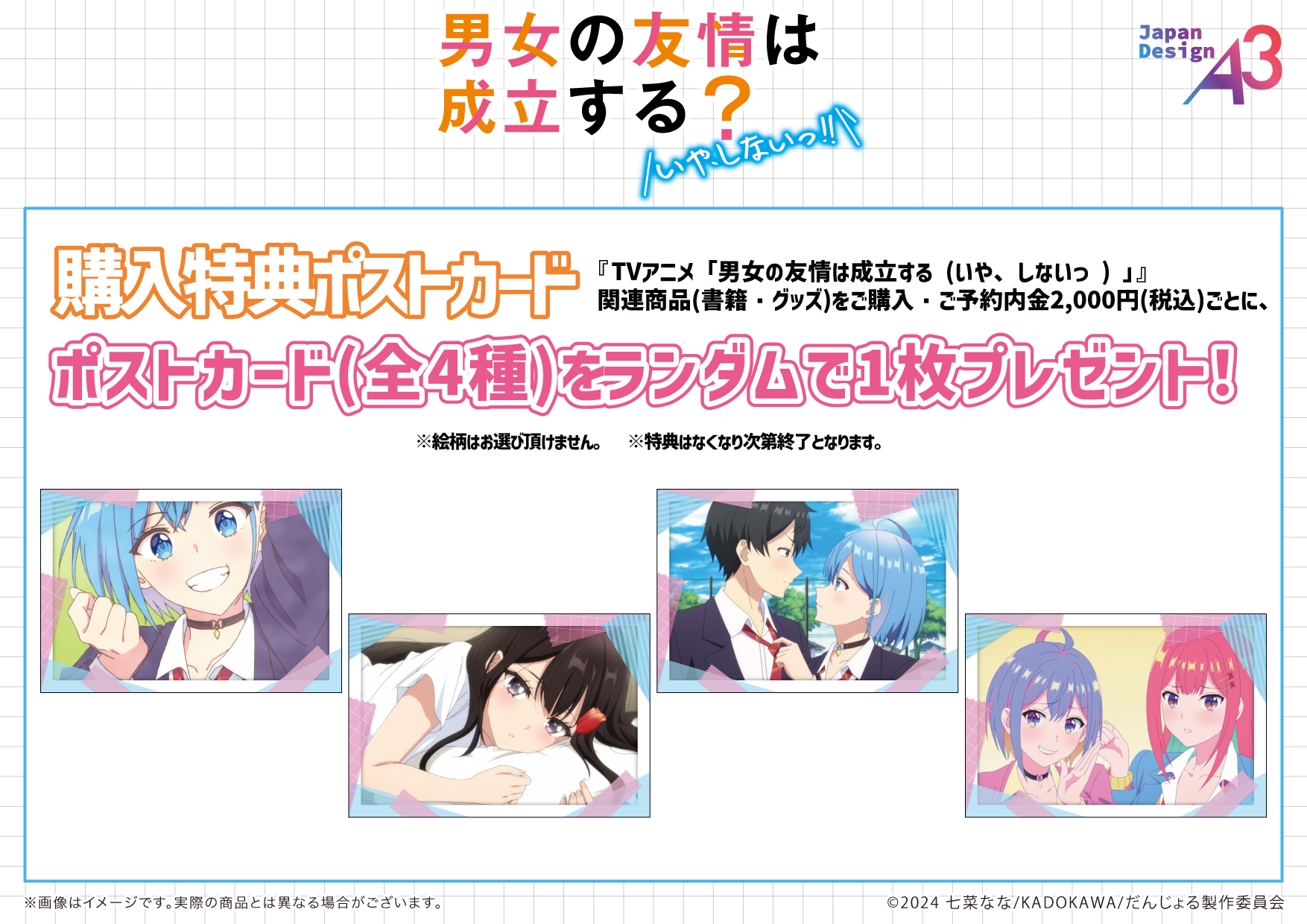 期間中、会場内にてTVアニメ『男女の友情は成立する?(いや、しないっ!!)』関連商品(書籍・グッズ)を購入・予約内金2,000円(税込)ごとに、特典ポストカード(全4種)がランダムで1枚プレゼントされます!