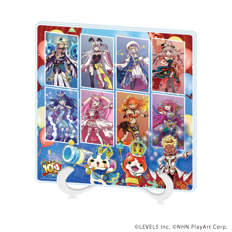 10周年記念にふさわしい、豪華な集合デザインのアクリルアートボード(およそ縦横18cm)。付属の台座を使えばテーブルの上でも立てて飾ることができるので、お好きな場所でイラストを鑑賞することができます!