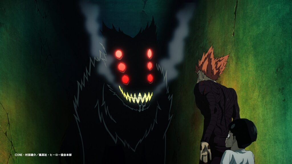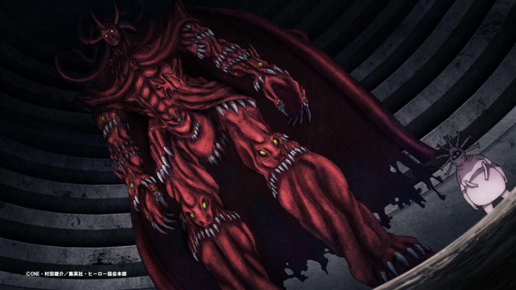 怪人協会に侵攻しタレオを助け出したガロウに次々と怪人たちが襲い掛かる。タレオを先に逃すも災害レベル:竜の育ちすぎたポチの強襲で、地底深くへと落下。そこに怪人王オロチとギョロギョロが待ち構えていた。