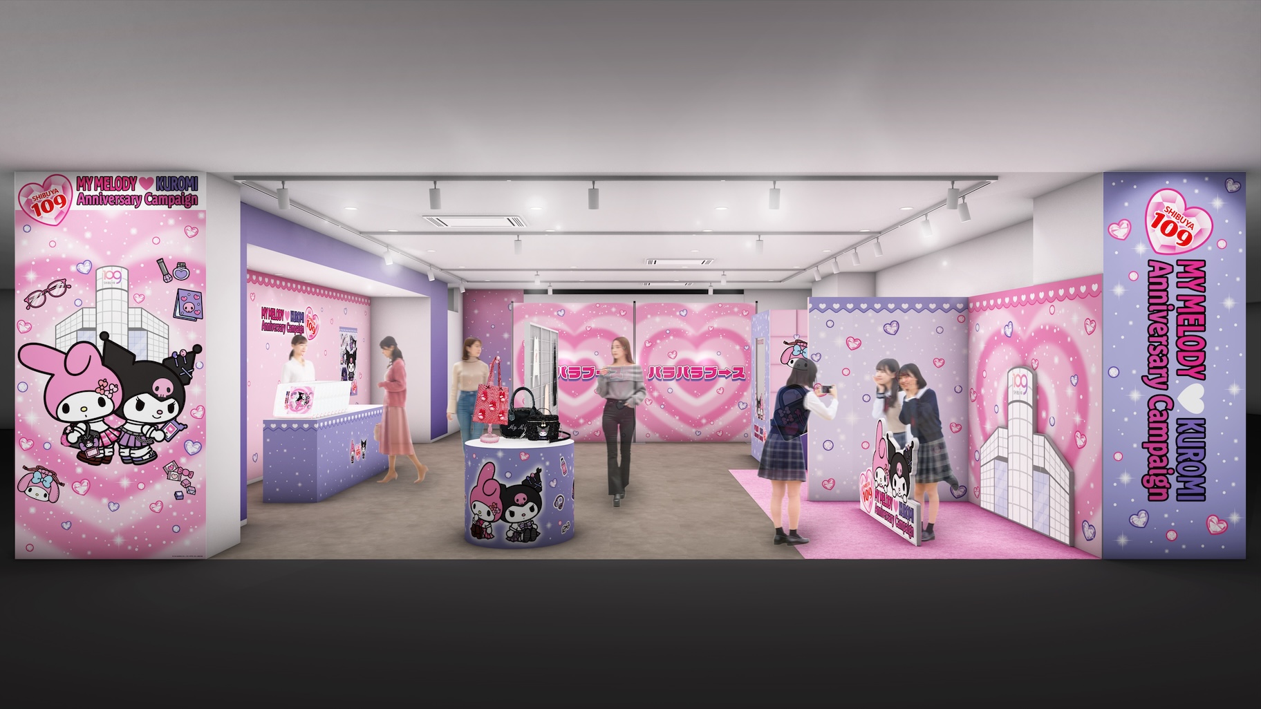 SHIBUYA109渋谷店8階「DISP!!!」にて、体験型ポップアップスペース「MY MELODY ♡ KUROMI 放課後アニバーサリーパーティ!」がオープン! 館内人気ブランドとのコラボアパレルの展示のほか、平成ギャルになりきったメロクロのフォトブースや、パラパラを踊って撮影できるブースが登場し、メロクロと一緒に放課後のようなひとときを楽しむことができます。