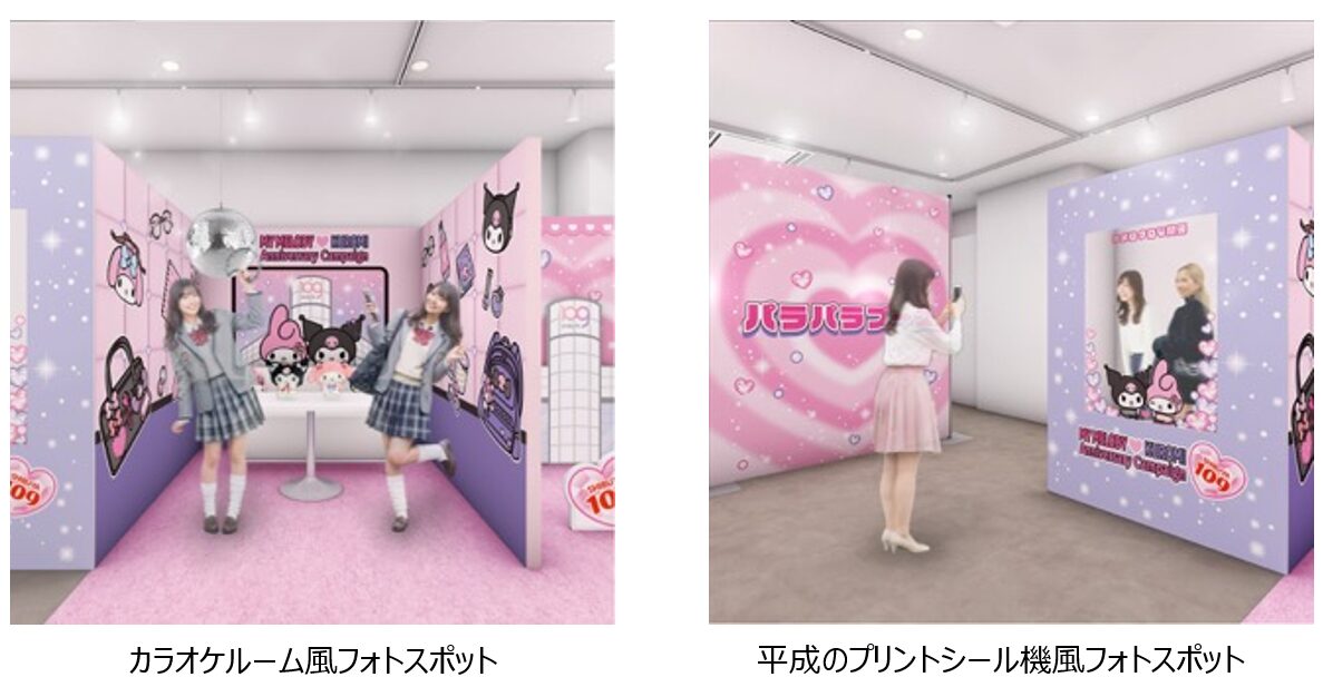 マイメロディ、クロミと一緒にSHIBUYA109に遊びにきたような写真が撮れるフォトスポットのほか、カラオケルーム風のフォトスポット、平成のプリントシール機風のフォトスポットなど、“放課後、友達と渋谷で遊んで盛り上がる青春シーン”をイメージした3つのフォトスポットが登場します。