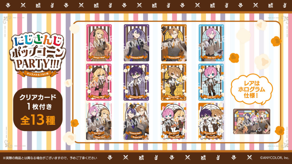 「にじさんじポップコーンPARTY!!! キャラメル&ソルト味」には、「ハッピートリガー」のビジュアルが使用された全13種のオリジナルクリアカードがランダムで1枚封入。クリアカードは、ノーマルカード12種に加え、4人の集合ビジュアルを使用したホログラム仕様のレアカード1種を含む、全13種がラインナップしています。