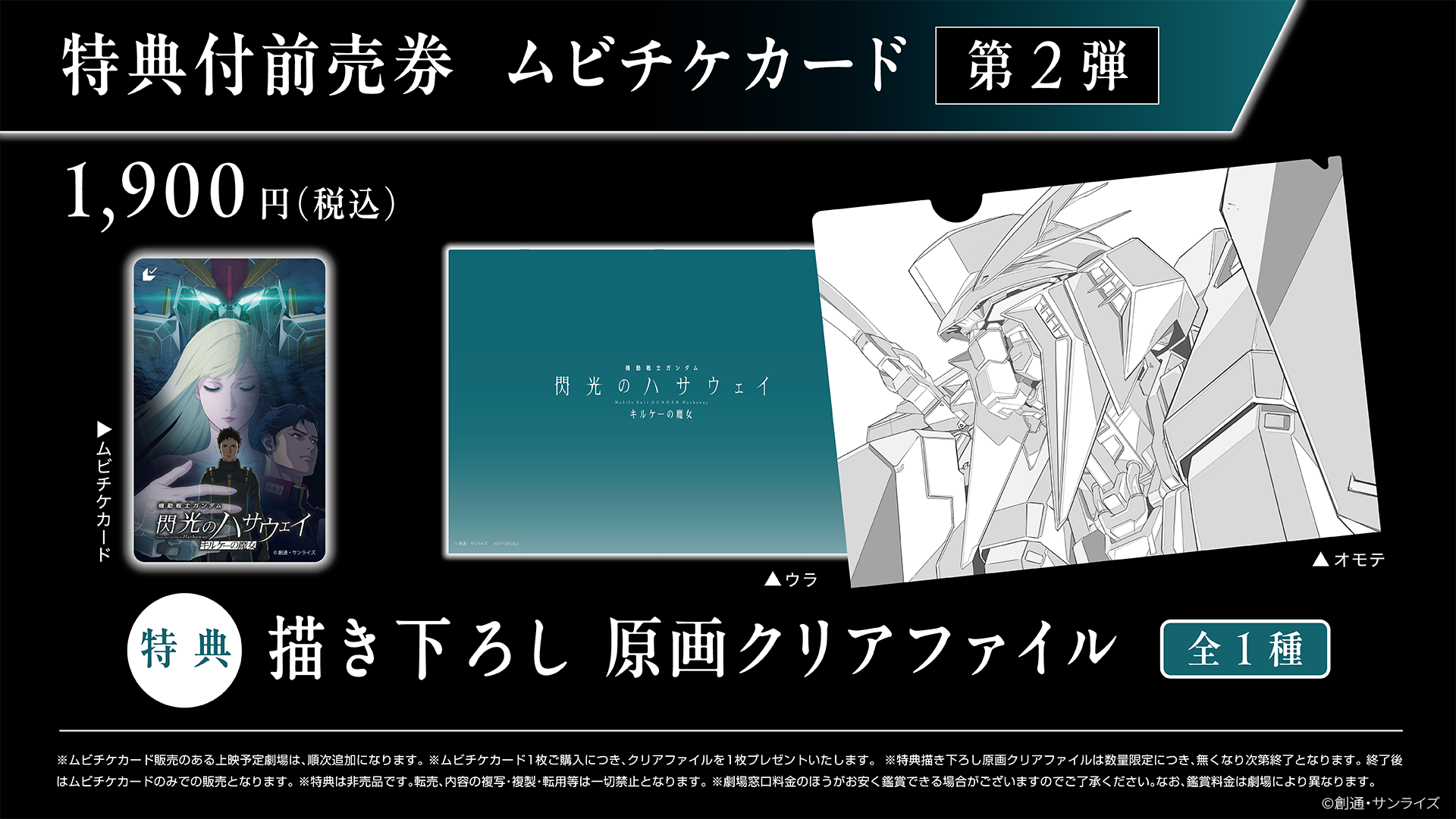 また、「ムビチケカード第2弾」にはメカニカルデザイン・中谷誠一氏による描き下ろし原画を使用したA4サイズの原画クリアファイル(全1種)が、「ムビチケ前売券(オンライン)」にはスマートフォンアプリ『SDガンダム ジージェネレーション エターナル』で利用可能な【プレミアムガシャチケット×1枚】が入手できるプロモーションコードが付属するようなので、どちらもお見逃しなく!