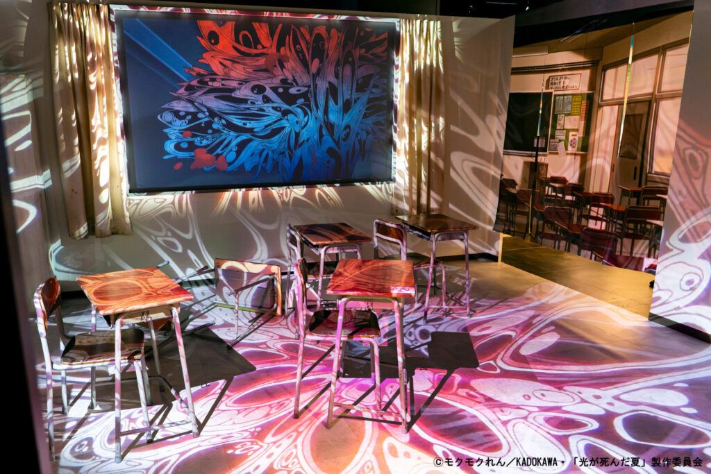 TVアニメ『光が死んだ夏』展では、貴重なアニメの複製原画や設定資料に加え、作中の印象的なシーンを再現したフォトスポットなど、多数の展示がされています。さらに「希望ヶ山高校の教室」「メンチ兄貴」「ヒカルの中」など、展覧会ならではの体験型スポットも。