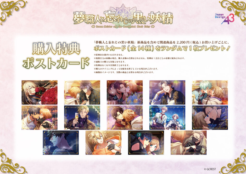 『夢職人と忘れじの黒い妖精』新商品を含めて関連商品を1会計2,200円(税込)お買い上げごとに、購入特典としてポストカード(全14種)をランダムで1枚プレゼント。