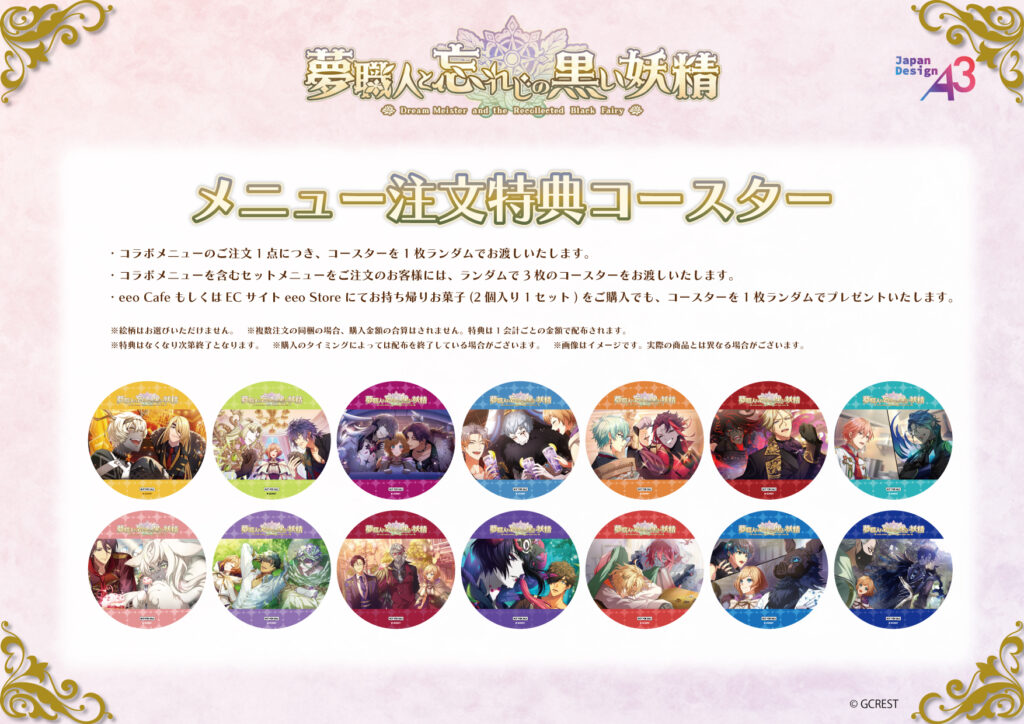 以下の配布条件を満たした方には、メニュー注文特典としてコースター(全14種)がプレゼントされます!