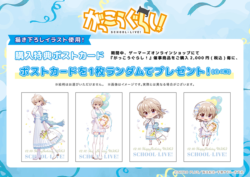期間中、ゲーマーズオンラインショップで『がっこうぐらし!』催事商品を購入2,000円(税込)ごとに、特典ポストカード(全4種)がランダムで1枚プレゼントされます!