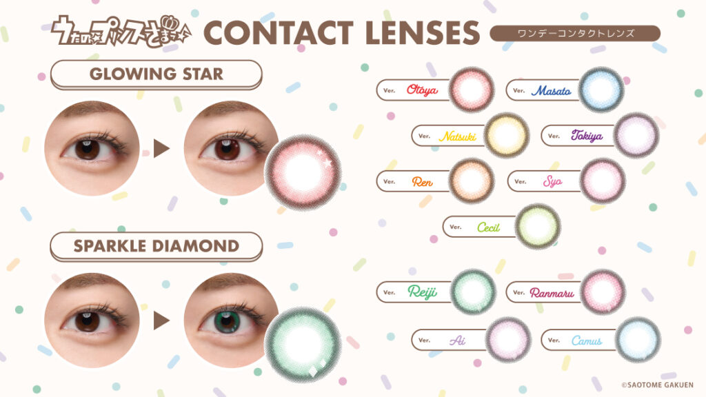 現在販売中の『うたの☆プリンスさまっ♪』のワンデーコンタクトレンズは、グループごとに異なるコンセプトになっており、情熱とまっすぐな夢を歌う7人組ユニット・ST☆RISH(スターリッシュ)をイメージしたワンデーコンタクトレンズは、キラキラと輝く“星”のような存在をイメージしたデザイン。