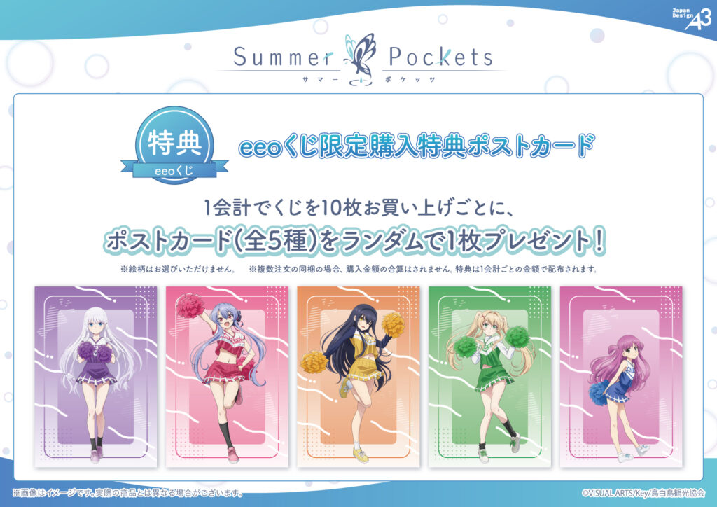 TVアニメ『Summer Pockets』の「eeoくじ」を1会計で10枚お買い上げごとに、ポストカード(全5種)をランダムで1枚プレゼント。