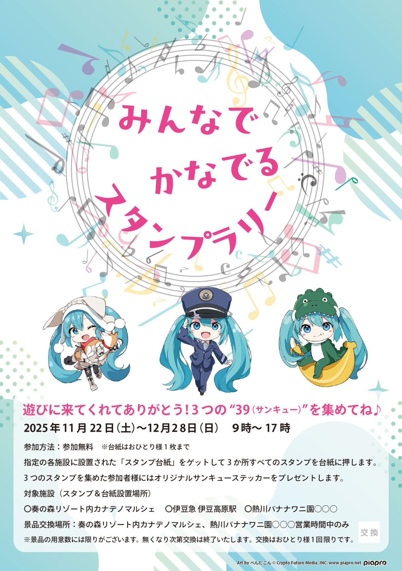同イベントでは、伊豆高原駅(伊豆急行)・熱川バナナワニ園・奏の森リゾートの3施設を巡る「みんなでかなでるスタンプラリー」が実施されており、3つの“39(サンキュー)”スタンプを集めると、「遊びに来てくれてありがとう!3つの“39(サンキュー)”を集めてね♪」というテーマの限定デザインステッカーがもらえます。