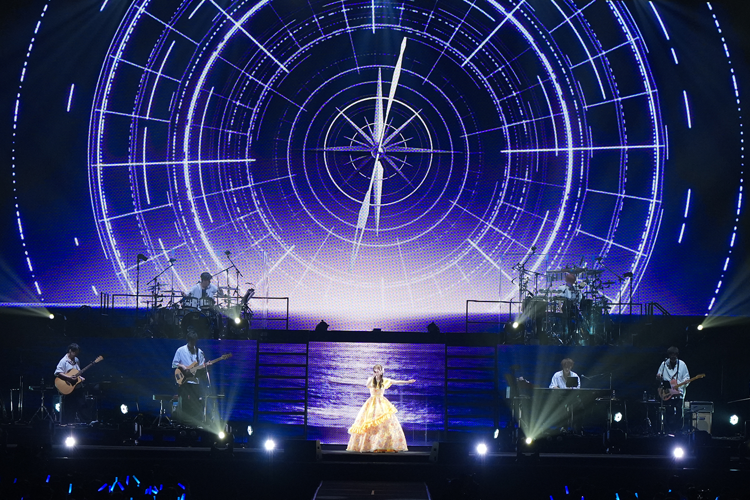 開演時刻、会場の照明が暗転すると同時に客席中のペンライトが⽔瀬のイメージカラーであるブルー⼀⾊に染まるなか、オープニングムービーがスタート。真っ⽩な空間を⼀⼈で歩む彼⼥が、⼿にしていたフラッグを突き⽴てて振り返ると、⾃然あふれる景⾊が魔法のように広がっていく。そうして⽔瀬がこれまで歩んできた道のりの豊かさが⽰されると、2階建てステージの上段、⾵船のように浮かぶカラフルな円形パネル越しにシルエット姿の⽔瀬が登場。「ファイナル楽しんでいきましょー!」と元気よく声をかけると、⾃⾝のデビュー曲「夢のつぼみ」でライブの幕を開ける。