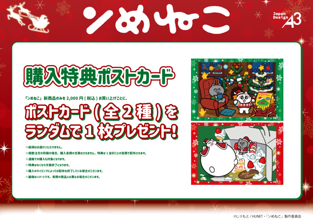 TVアニメ『ンめねこ』新商品のみを、1会計につき2,200円(税込)お買い上げごとに、ポストカード(全2種)をランダムで1枚プレゼント!