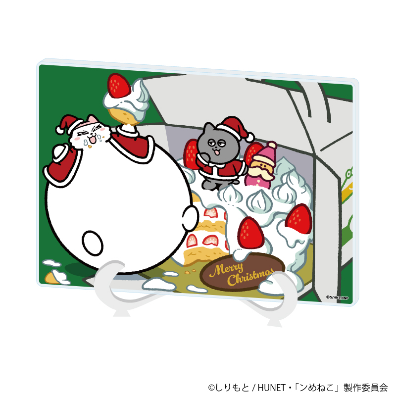 毛糸のセーターやサンタ衣装に着替えた「ンめねこ」と「うすくろ」の全身姿が堪能できる、縦横最大15cmのアクリルスタンドです。キュートなクリスマスケーキの台座にもご注目!