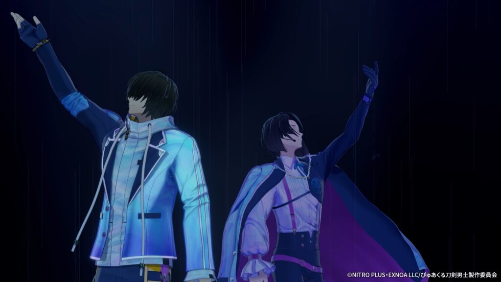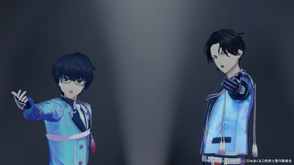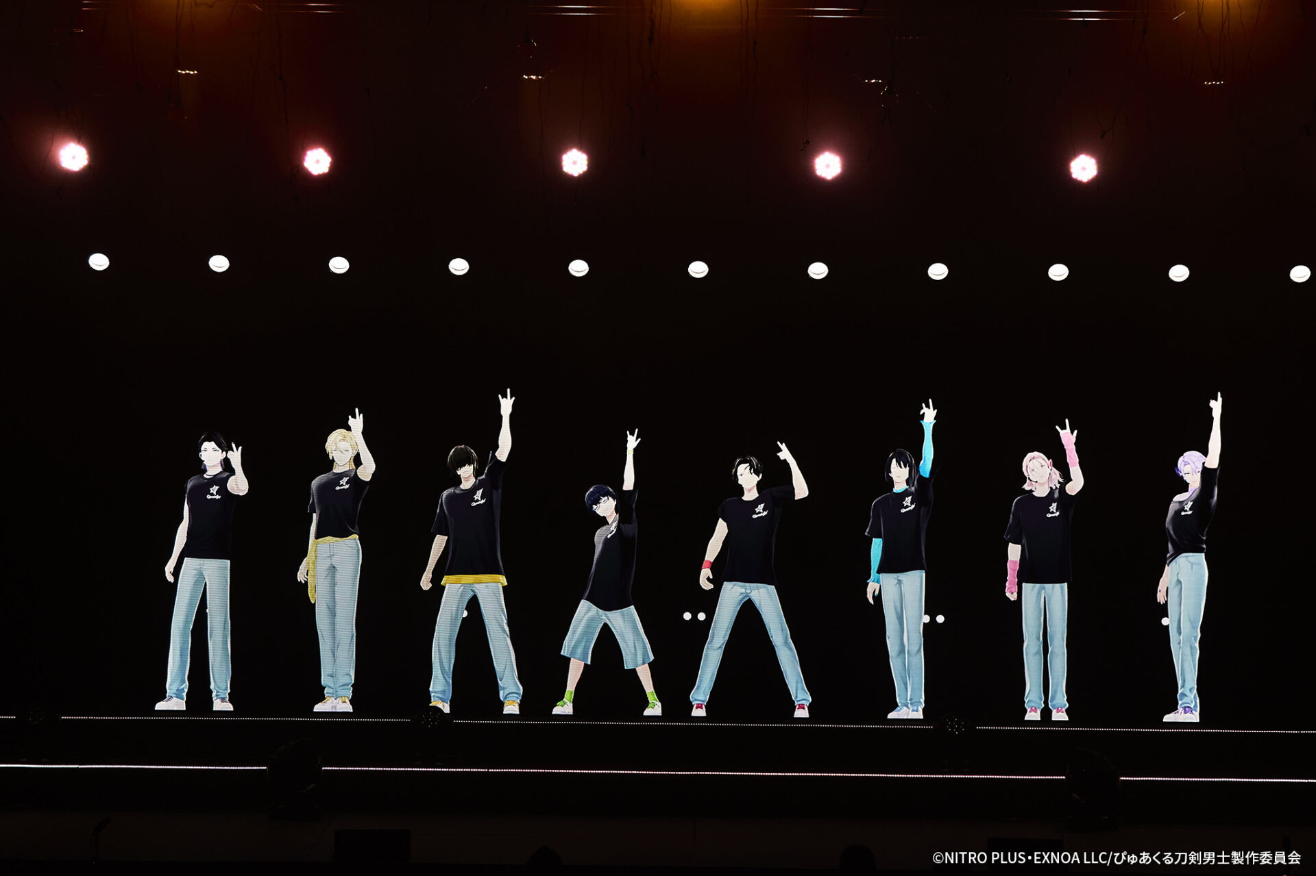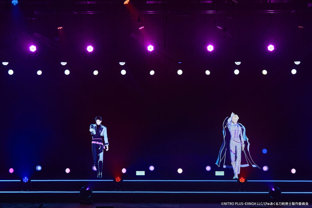 3回目のMCでは、ここまでにユニットで披露した楽曲の裏話などが語られた。続く9曲目は桑名江と松井江による「さめざめ」。美しい雨に打たれながら楽曲をしっとりと歌い上げた。10曲目はテイスティング公演時のメンバー、篭手切江、豊前江、桑名江、松井江、五月雨江、村雲江、6振りによるデビュー前の楽曲「凛花繚乱」。光と花の演出をバックに、華やかなステージで盛り上げた。楽曲後半に向けて、どんどん花開いていく様子に、ワクワク感を掻き立てられる一曲だ。11曲目「光と_」は稲葉江&富田江によるパフォーマンス。2振りのハーモニーが堪能できる楽曲での注目ポイントは、2振りの表情。サイドのモニターにも注目すると、大人のムードが漂いまくる2振りの表情にも魅了されてしまった。