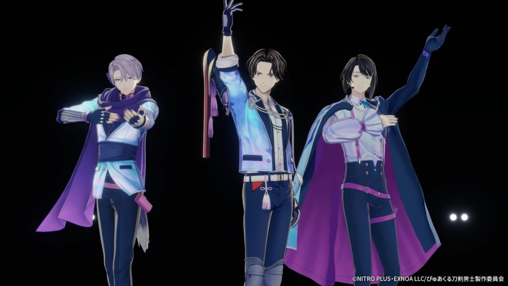 2曲目は「テイスティング公演」でも披露した「GO&GO!!!」。パフォーマンス前には観客に一緒に踊ってほしい振り付けの確認をする場面も。篭手切江と豊前江は前を向き、他のメンバーは動きが分かりやすく伝わるように、観客と同じ向き(観客に背を向けた形)で振り付けの練習をしてからの楽曲スタートとなった。歌唱をした4振りに加え、他の4振りもダンスや「Hey!」の掛け声で参加。歌詞の一部がスクリーンに映し出されるので、Live初参戦でも難しさを感じることなく一緒に踊り、掛け声をかけることができるのもうれしいポイント。スクリーンには様々な色や形の星も写し出されるので、観ているだけでテンションが上がる。客席に向かってライトが当たる演出もあり、一緒にLiveを作り上げている感覚が味わえるのもうれしい。