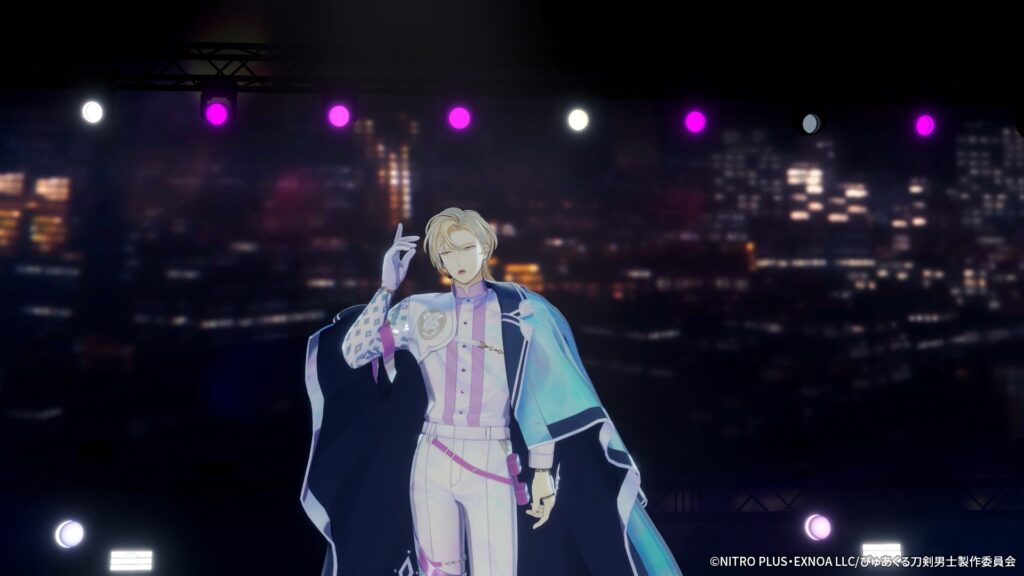 続く、稲葉江&富田江のMCタイムではステージ袖から見ていた、篭手切江を呼び込むと、篭手切江から2振りへファンサのレクチャータイムが行われた。教える立場のはずの篭手切江が、稲葉江&富田江のファンサにキュンとしすぎて、腰を抜かしたりする場面もあったが、無事にレクチャーは終了。本丸中を巻き込んだ「肝試し大会」の裏話などをちょっぴり披露した後には、稲葉江&富田江による未発表のデュエット曲「涙乾涸」の披露も。VJ映像には都会の夜景が映し出され、大人なムードが漂う中でパフォーマンス。楽曲途中でスタンドマイクも登場し、2振りそれぞれの個性が際立つマイクパフォーマンスも楽しめる1曲となった。