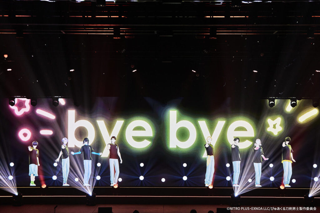 ぴゅあのすけとくるのすけの音頭の元行われたアンコールをうけ、「あふたーぐろーすたー」へ「ちぇーんじ」した8振りが再登場し「GO&GO!!!」と「Ghostella」をパフォーマンス。本編のバシッと決まったダンスだけでなく、すこし砕けた、いつもと違った楽曲とGhostellaの雰囲気を味わうことができた。8振りそれぞれの着こなしもチェックして、今後のLive参戦でのファン自身の着こなしの参考にもしたいところだ。アンコールでのMCでは記念の写真撮影のコーナーもあった。写真のポーズは「投げキッス」。篭手切江や富田江らからのアドバイスに、最初はちょっぴりしぶしぶだったものの、クールに決めた稲葉江の投げキッス写真は貴重な1枚に。こういった写真が8振りの新たな魅力が発見できるものになったのかもしれない。