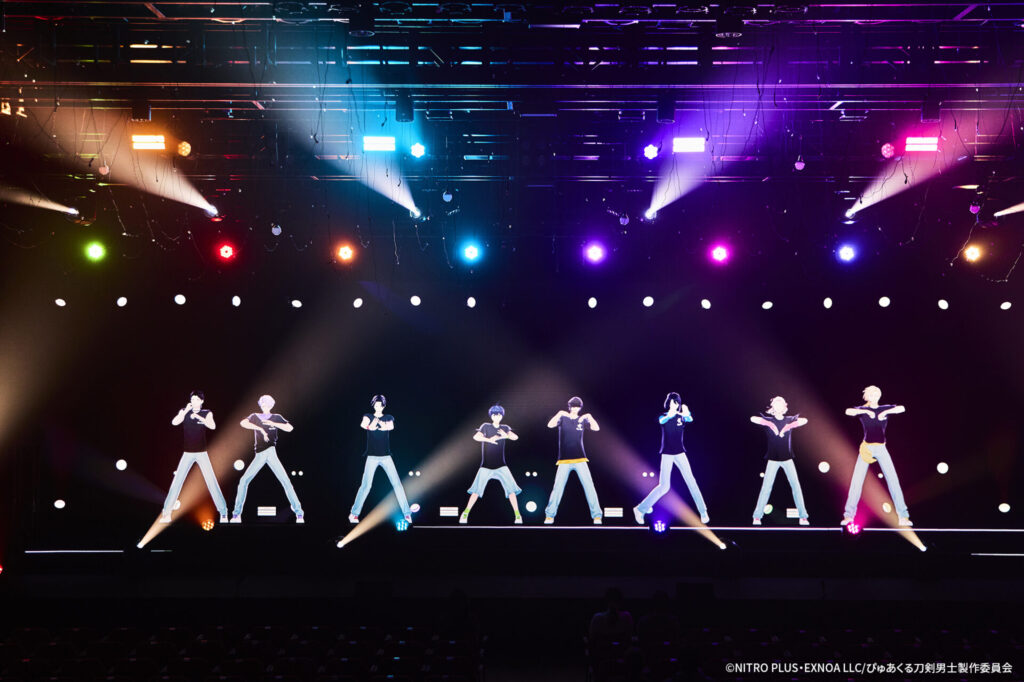 7曲目は豊前江、松井江、五月雨江の3振りによる「Shall We…?」。それぞれがこの楽曲のコーレスのレクチャーを丁寧に行った後、パワフルなパフォーマンスで観客を魅了。会場がまるでダンスフロアになったような感覚が味わえる楽曲で、レクチャーの際の豊前のしめくくりにもあったように、ノリだけでも全身で楽しめる時間となった。さらに、五月雨のアクロバットなダンスにも注目。バックスクリーンに流れるグルーヴ感溢れるVJも決まり、3振りのダンスとのリンクも堪能できる。8曲目「No More」の前には8振りによる刀剣男士らしい登場シーンも見られる。ここで五月雨は天井から舞い落ちてくるというアクロバットな動きで魅せる。稲葉江&富田江はキラキラとした光を纏い、イリュージョンで登場、豊前江は誰よりも早い走りで登場するなど、個性豊かな表現を見せていた。「No More」は豊前江が「俺たちの見せ場だ!」と篭手切江との2振りのハーモニーで歌い上げる。6振りがしなやかなダンスで、ライティングとVJ映像は赤と黄色をメインにした情熱的な演出で、2振りによる熱い歌声を盛り上げた。