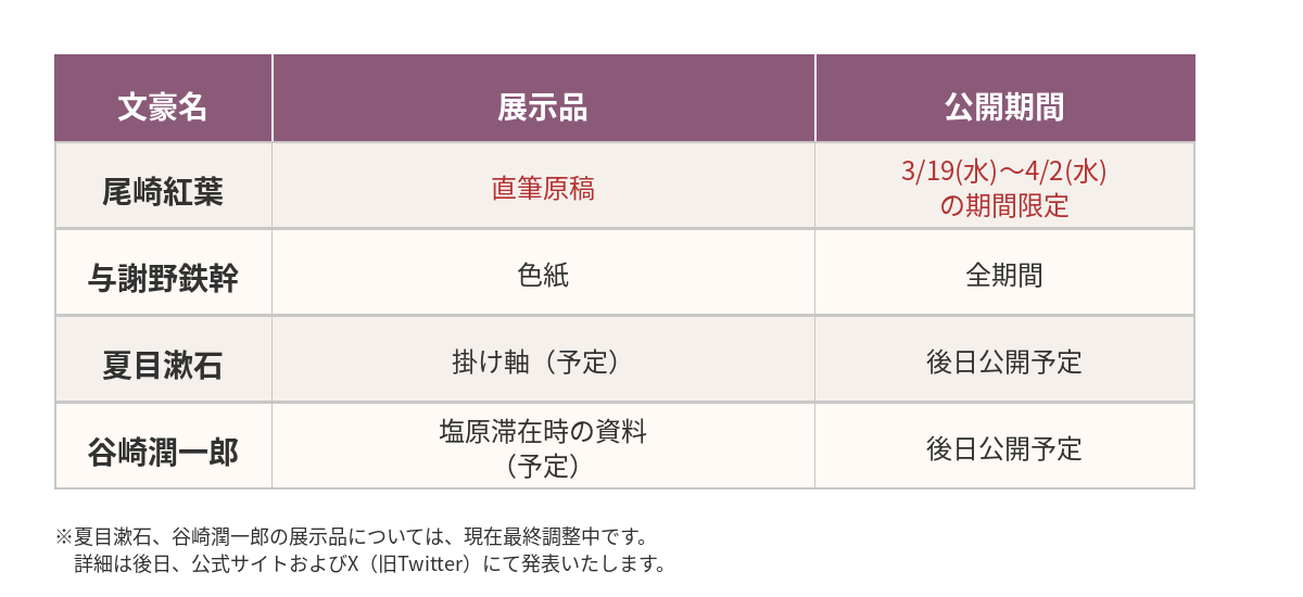 特別企画展では、尾崎紅葉の直筆原稿をはじめ、文豪たちにまつわる門外不出の貴重な資料が展示されるとのことです。