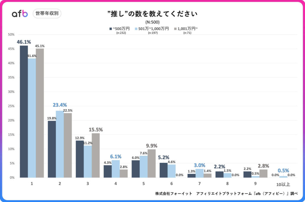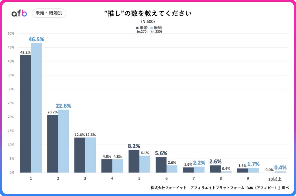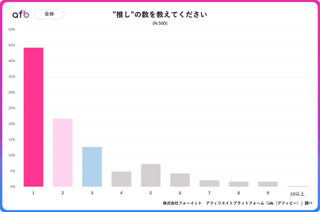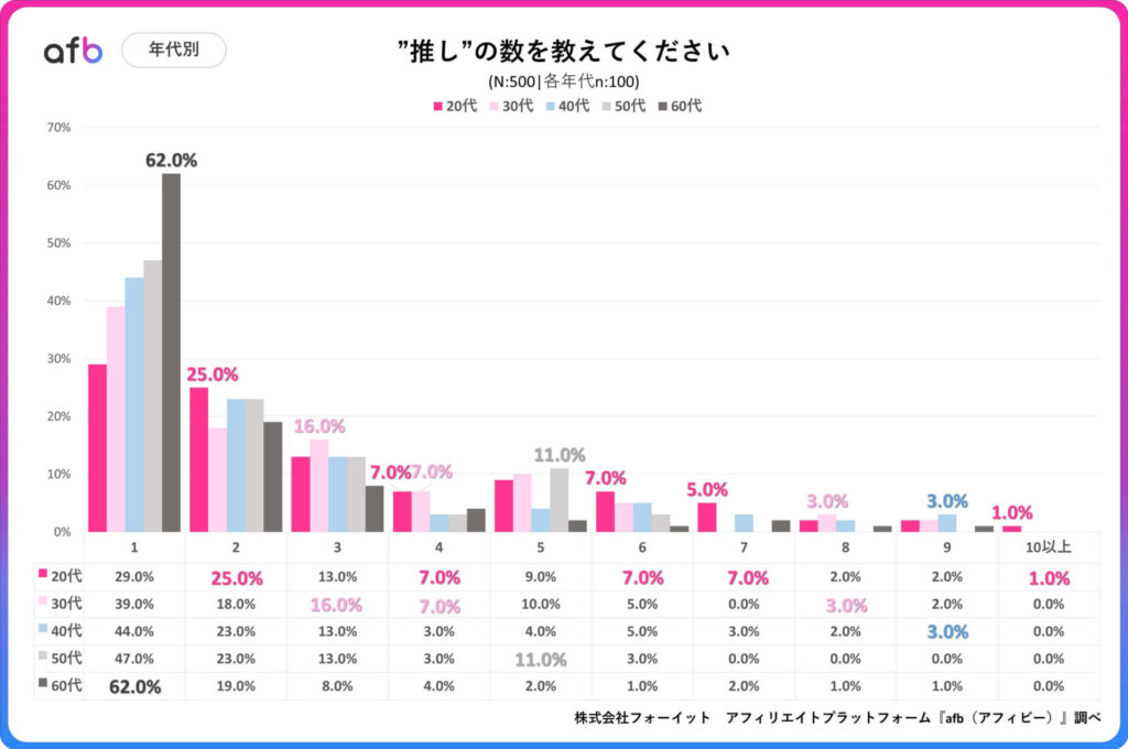 アフィリエイトプラットフォーム「afb(アフィビー)」の開発運用を行う株式会社フォーイットは、全国の20代~60代までの男女500人を対象に「推し活」に関するアンケートを実施、年代別等の特徴について、その結果を発表しました(調査実施日:2025年6月19日~2025年6月23日)。
