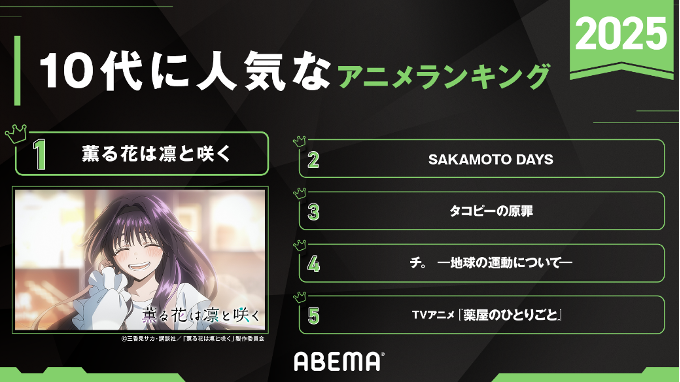 「10代に人気なABEMAアニメランキング」が発表! 2025年最も10代に見られたアニメはTVアニメ『薫る花は凛と咲く』【ABEMA調べ】